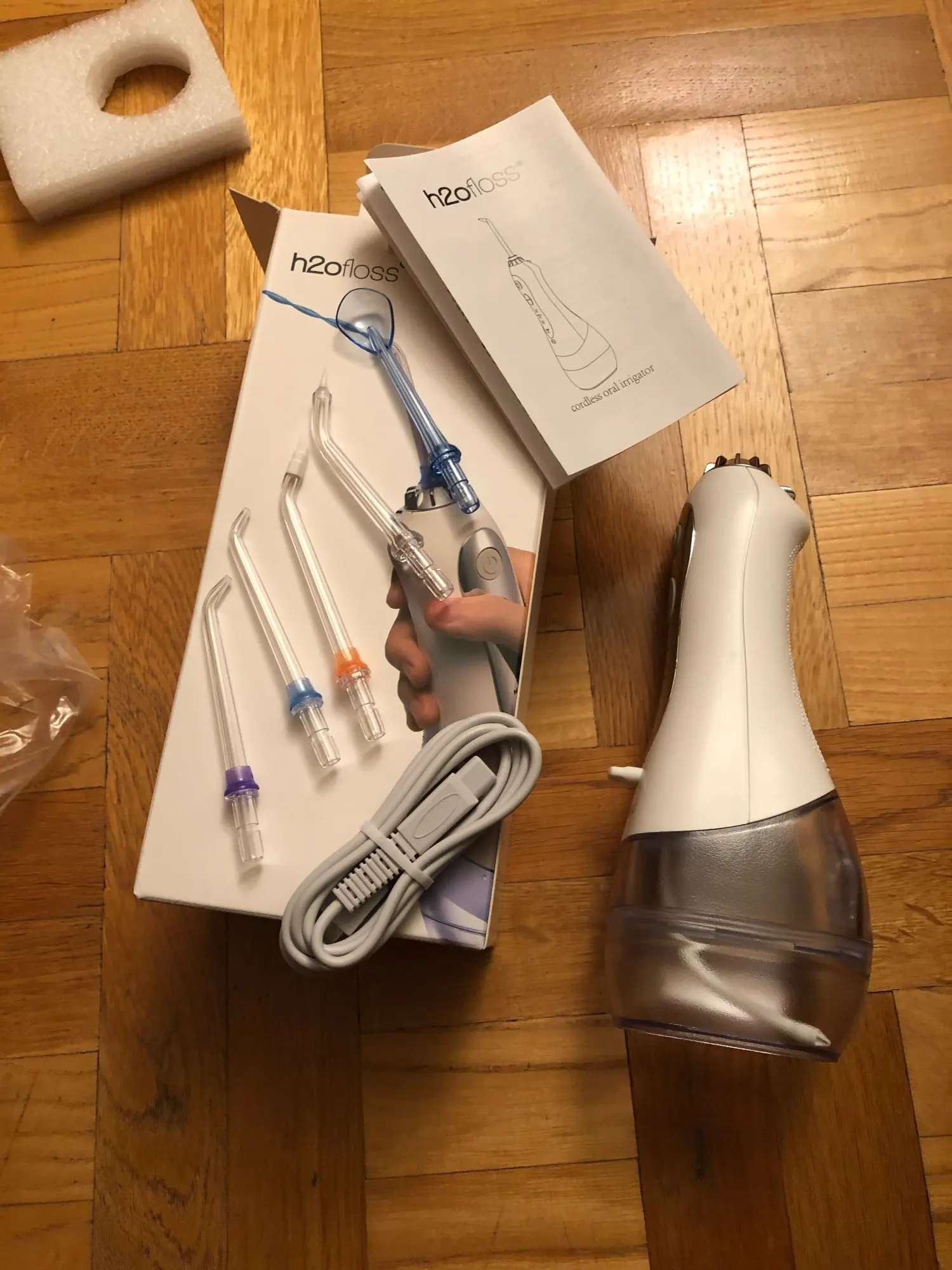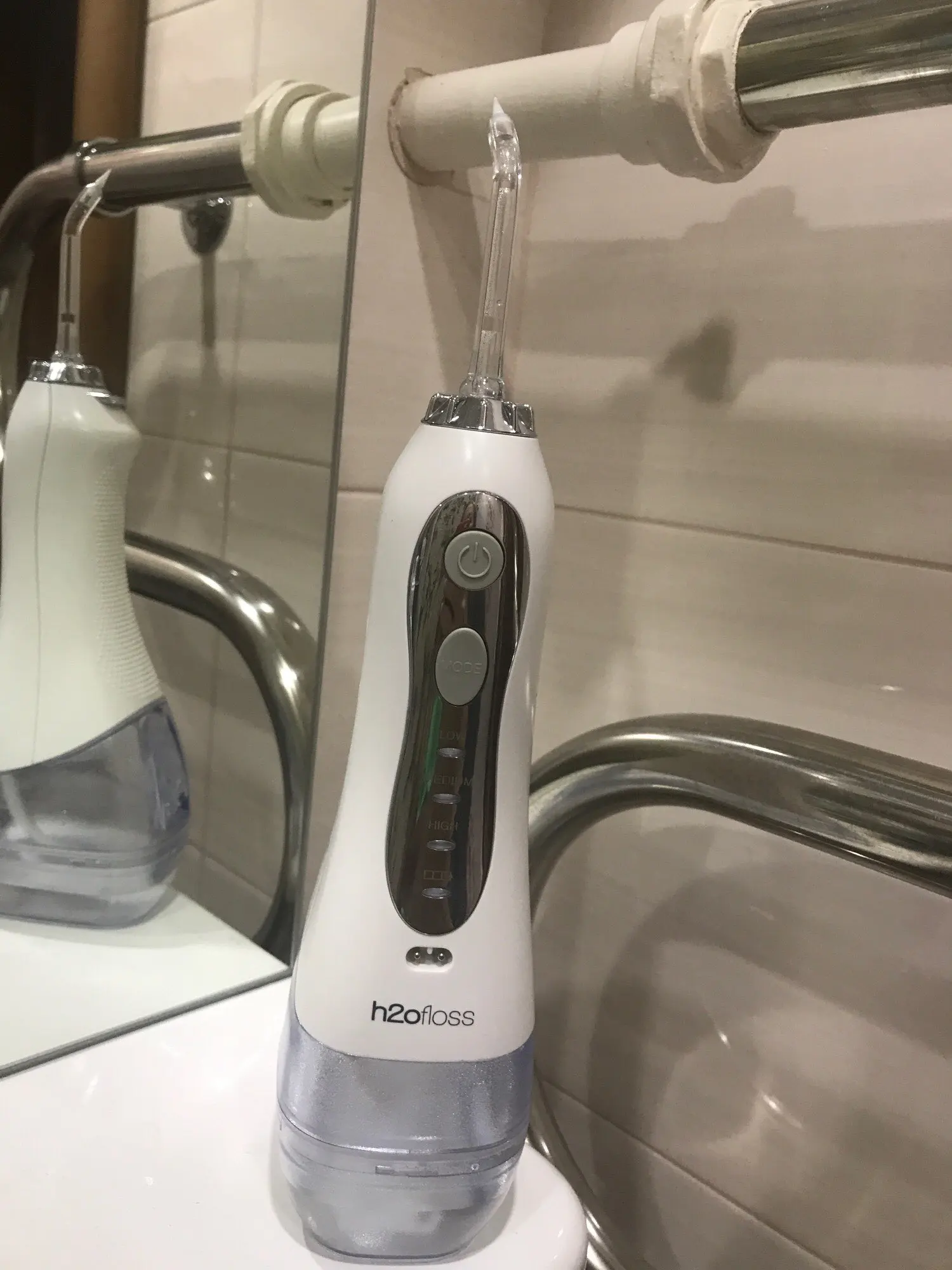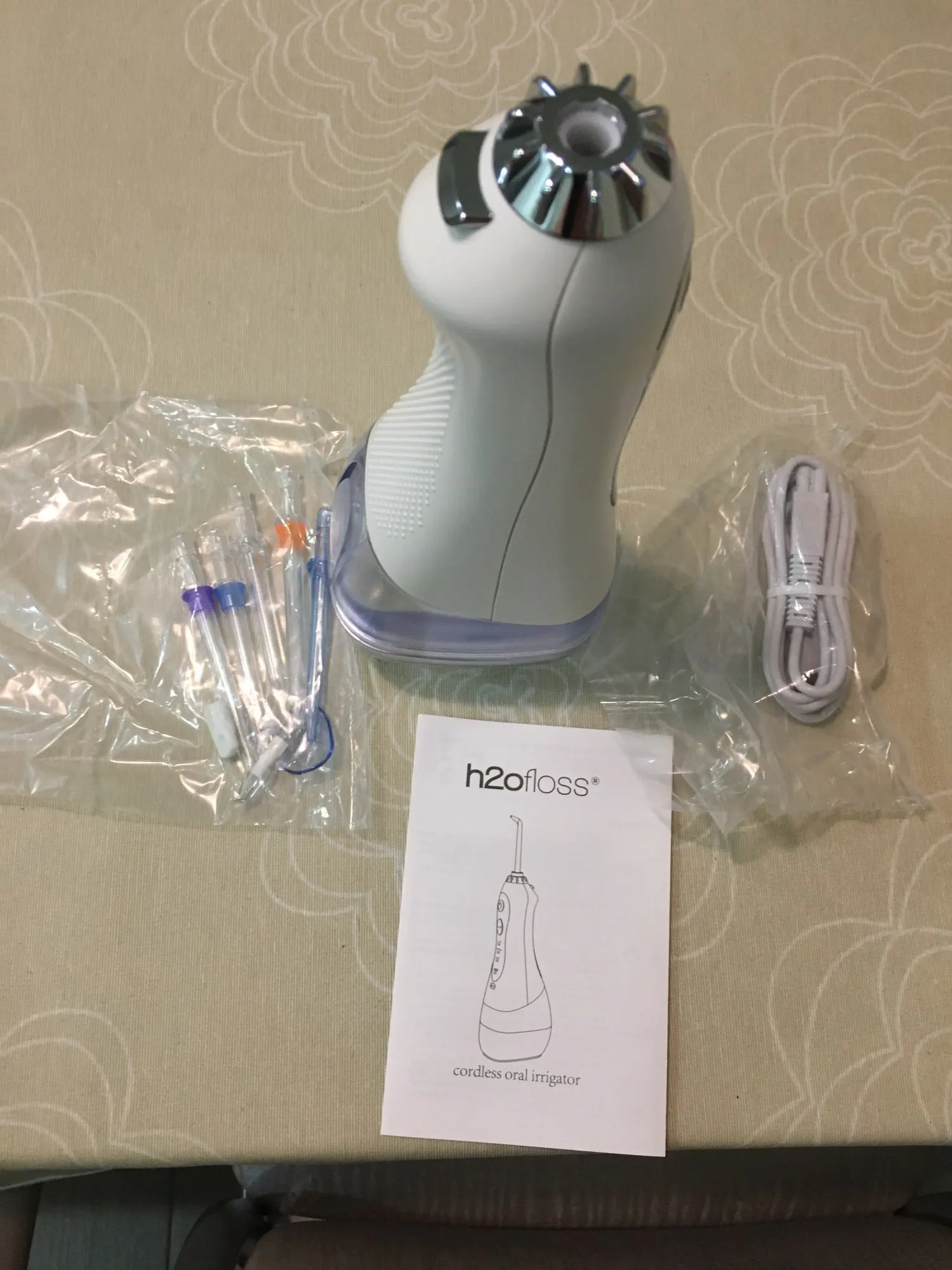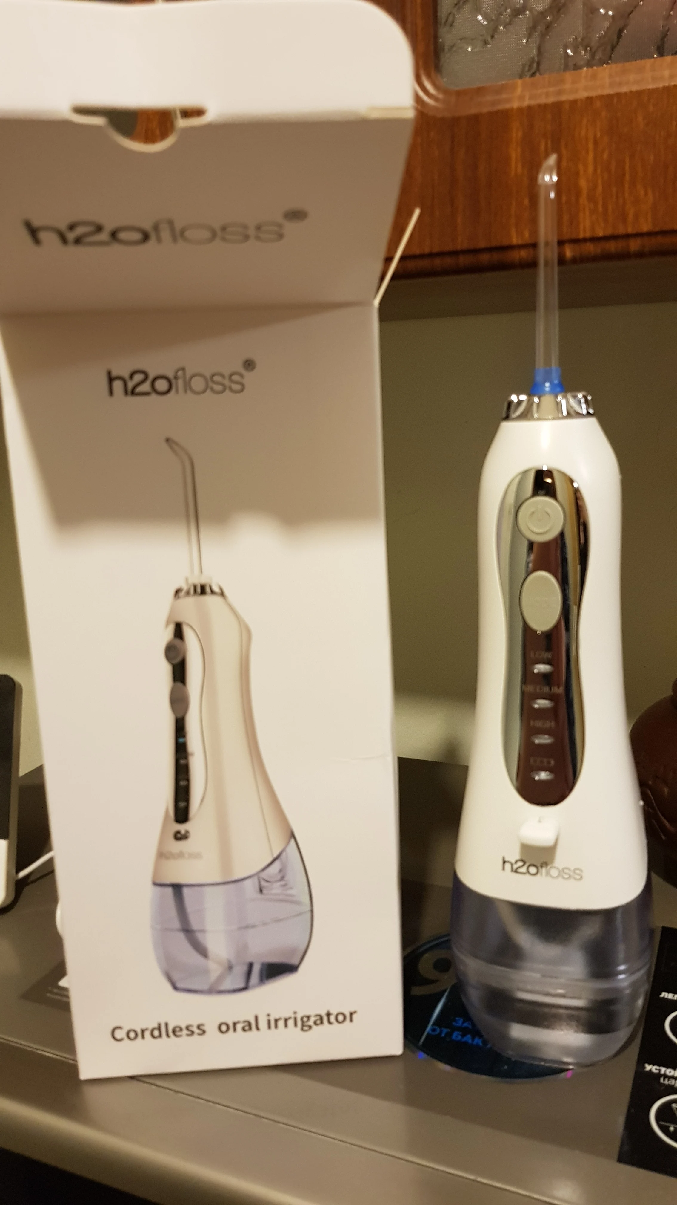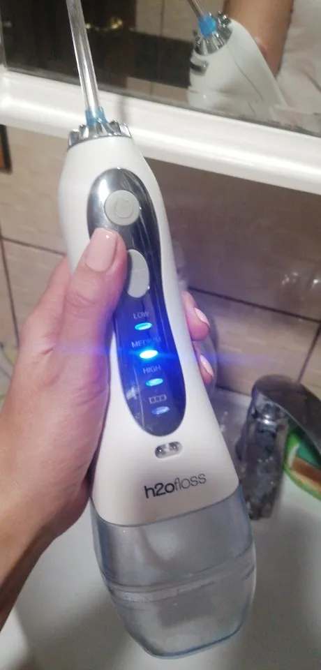 Товар соответствует описанию. Прямо из коробки ирригатор достал заряженным, не знаю только на сколько хватит этого заряда. Работает отлично на всех режимах. С момента заказа посылку ждал 22 дня. Но в итоге всё пришло идеально. Советую. Если что, дополню отзыв позже.