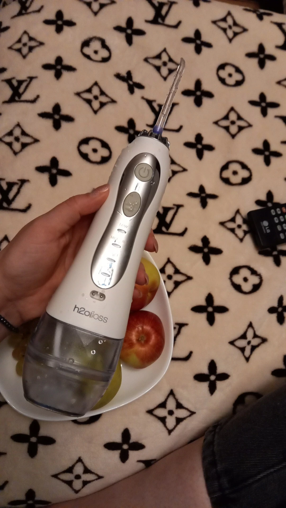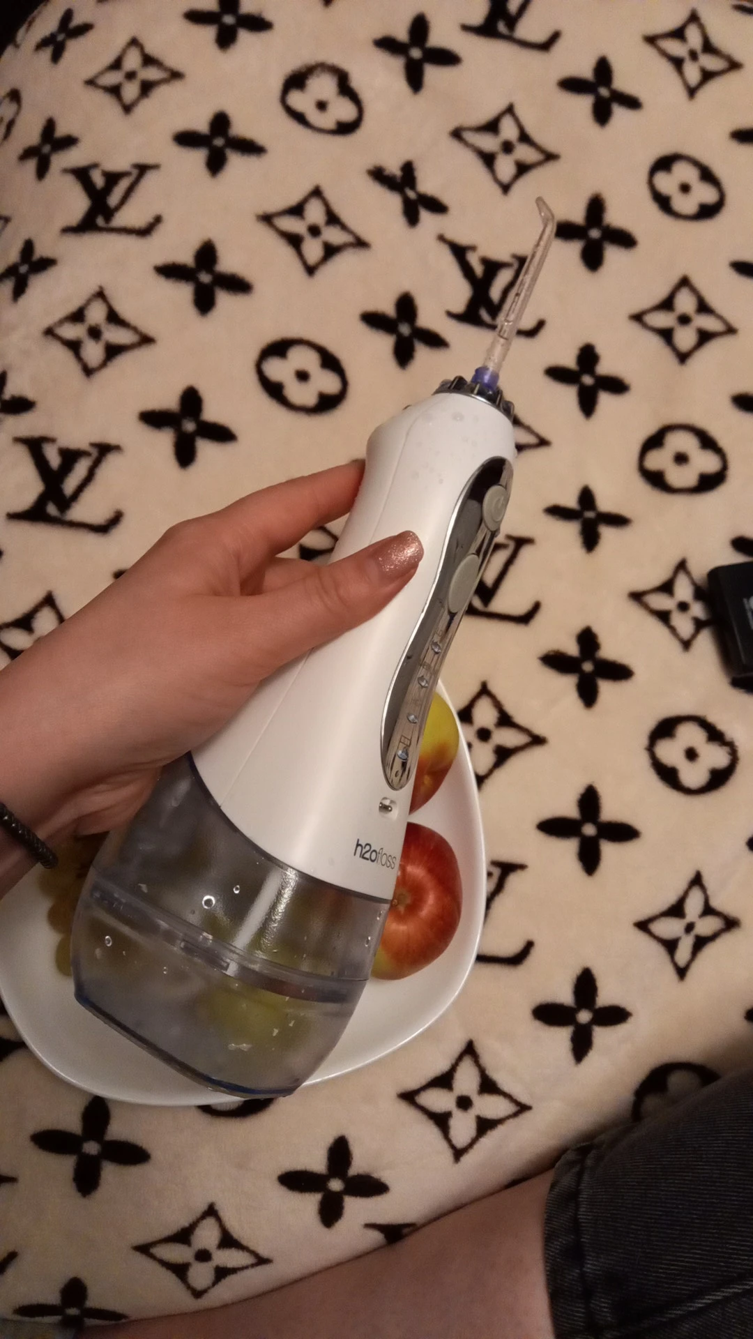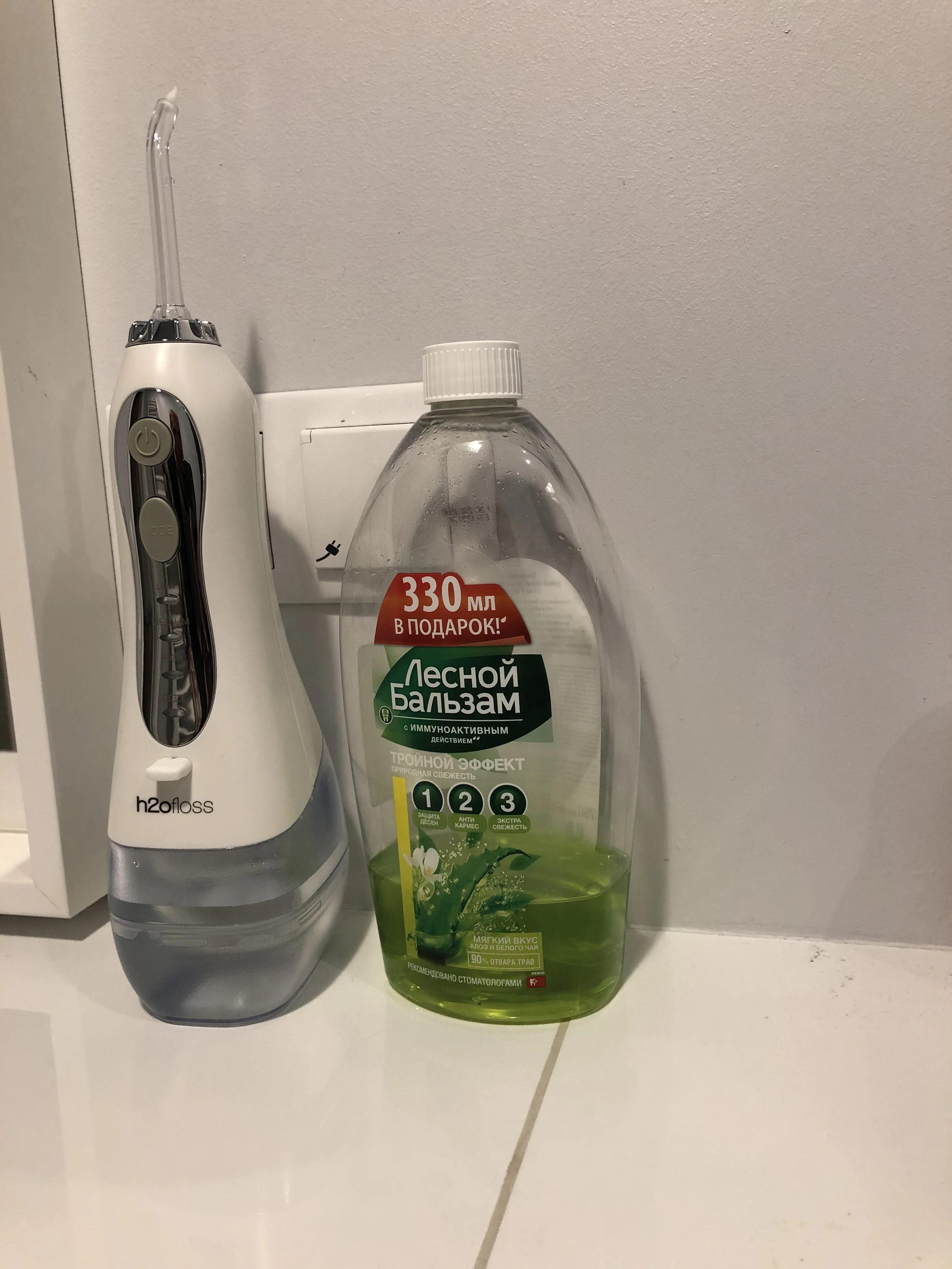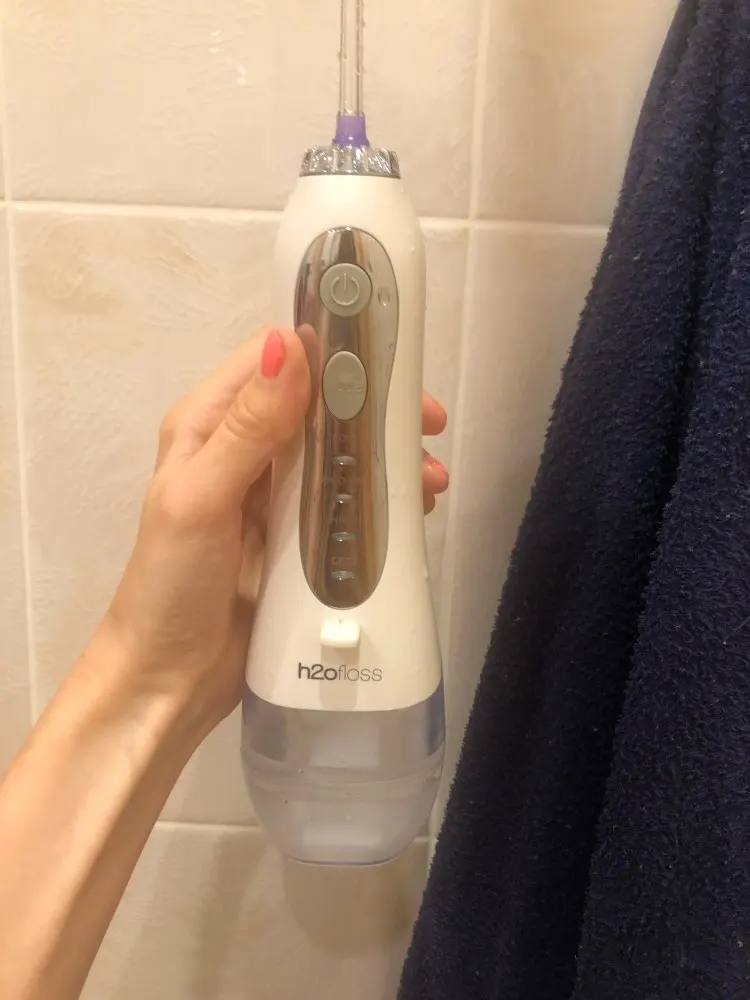Пришло супер быстро. Доставка на дом. Работает. Слабый напор пробовала, десны выдержали. Нормально чувствуется, но хочется немного посильнее. Среднею пока не пробовала. Пробовала насадку для чувствительных (парадонт) и обычную она немного чувствительней чистит. Воду действительно нужно доливать на одну чистку всего рта. На половину передние зубы хватает 300мл.