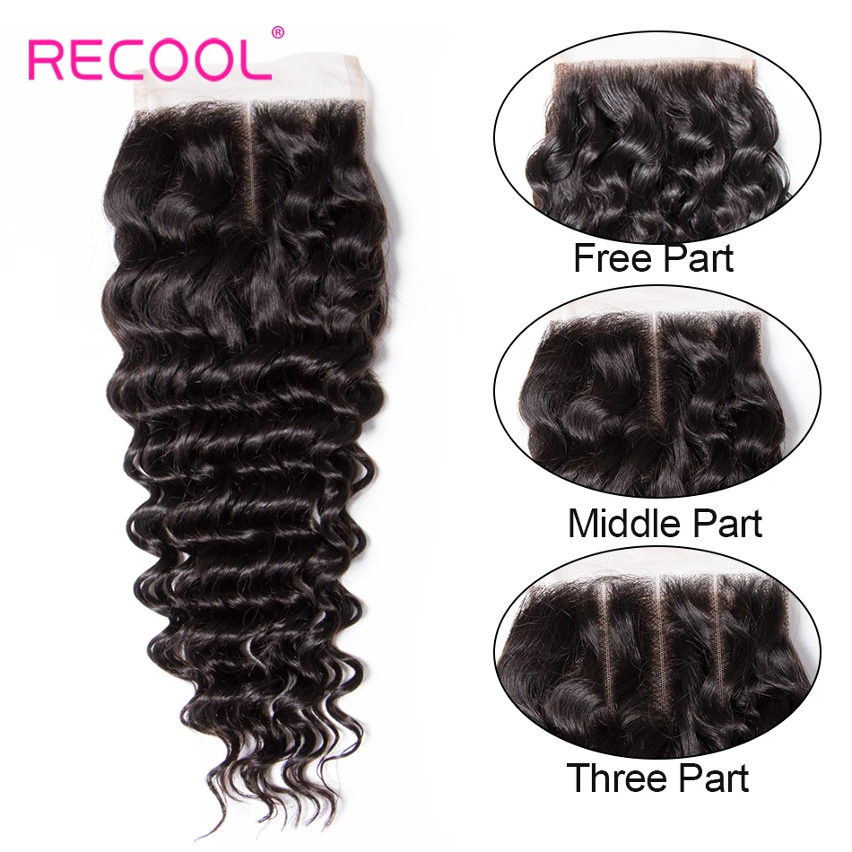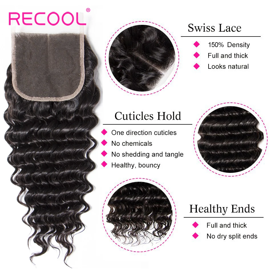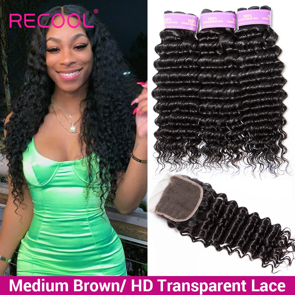 Recool бразильские пучки глубоких волн с закрытием 3 Budnles со швейцарским HD прозрачным 4X4 кружевное закрытие натуральные кудрявые пучки волос