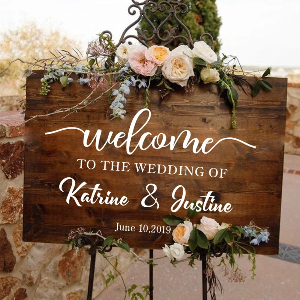 Свадебные пользовательское имя и дата виниловая наклейка на стену для помолвкиПраздник платье, платье на день рождения, вечерние Добро Пожаловать Знак Свадебные украшения