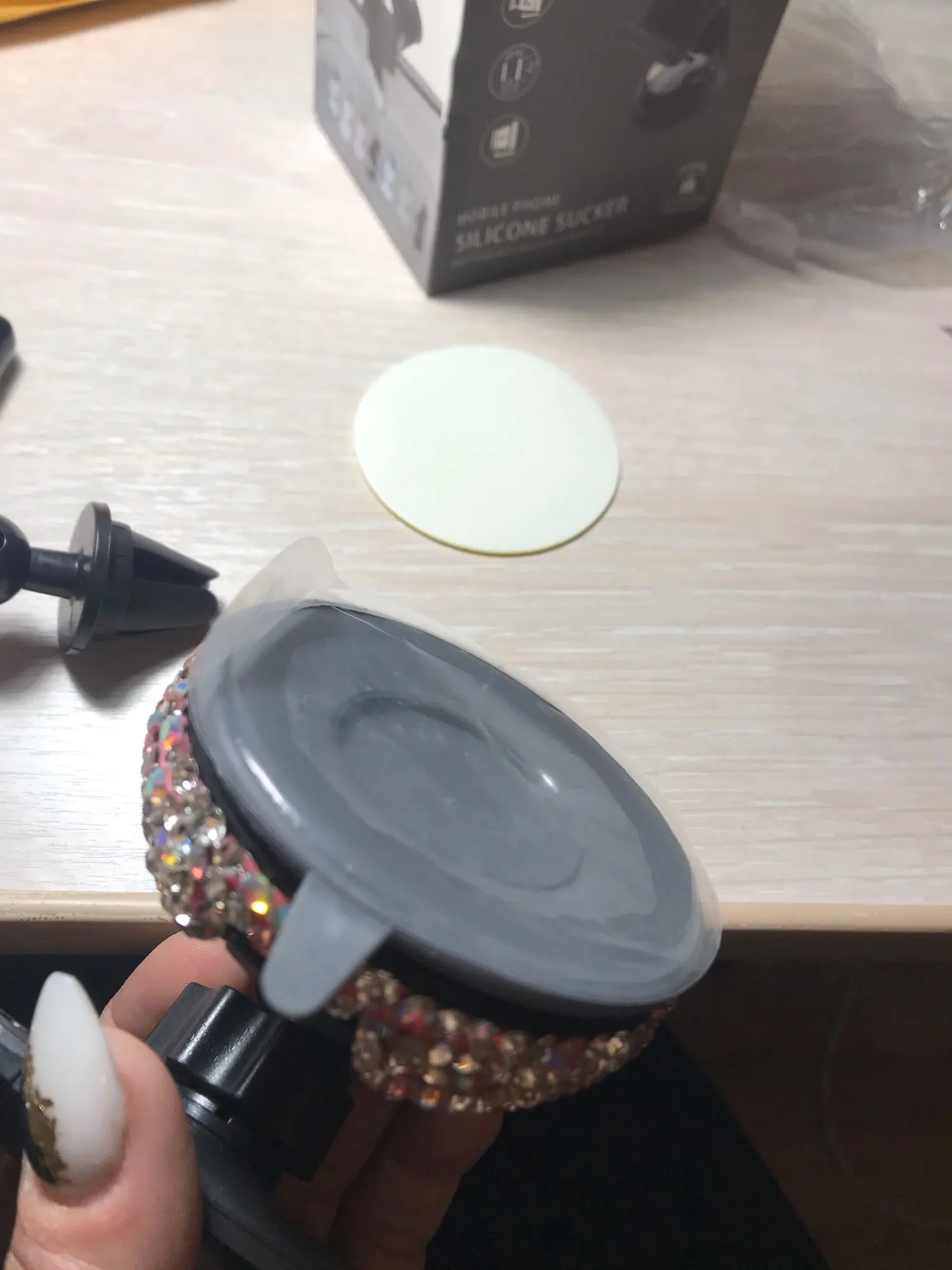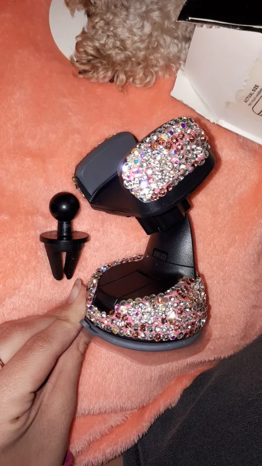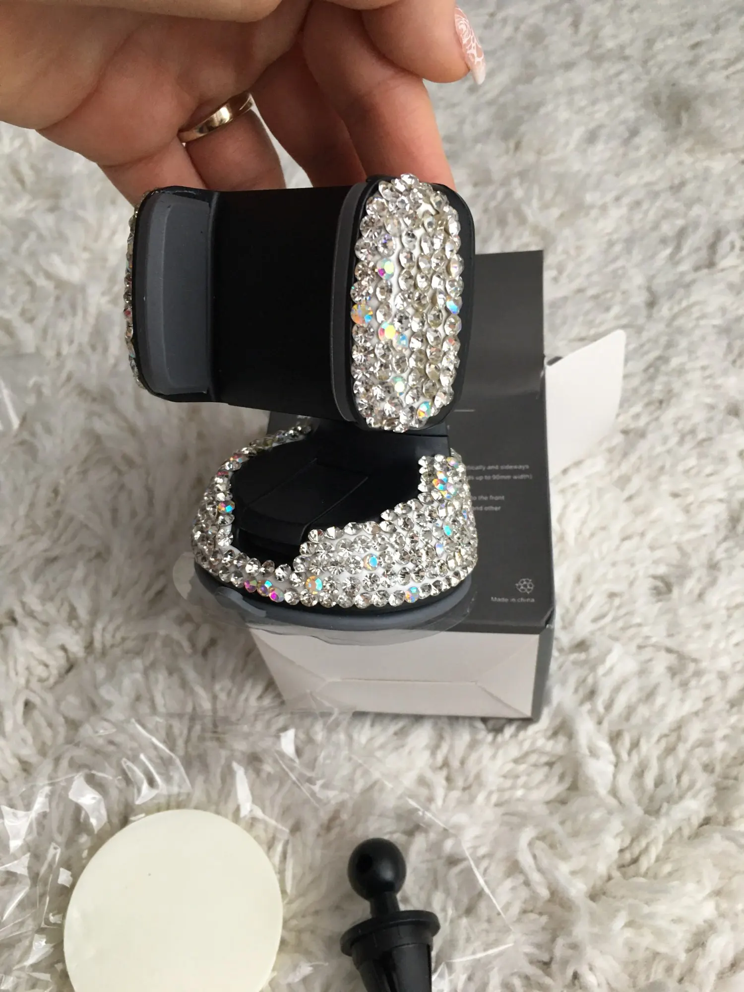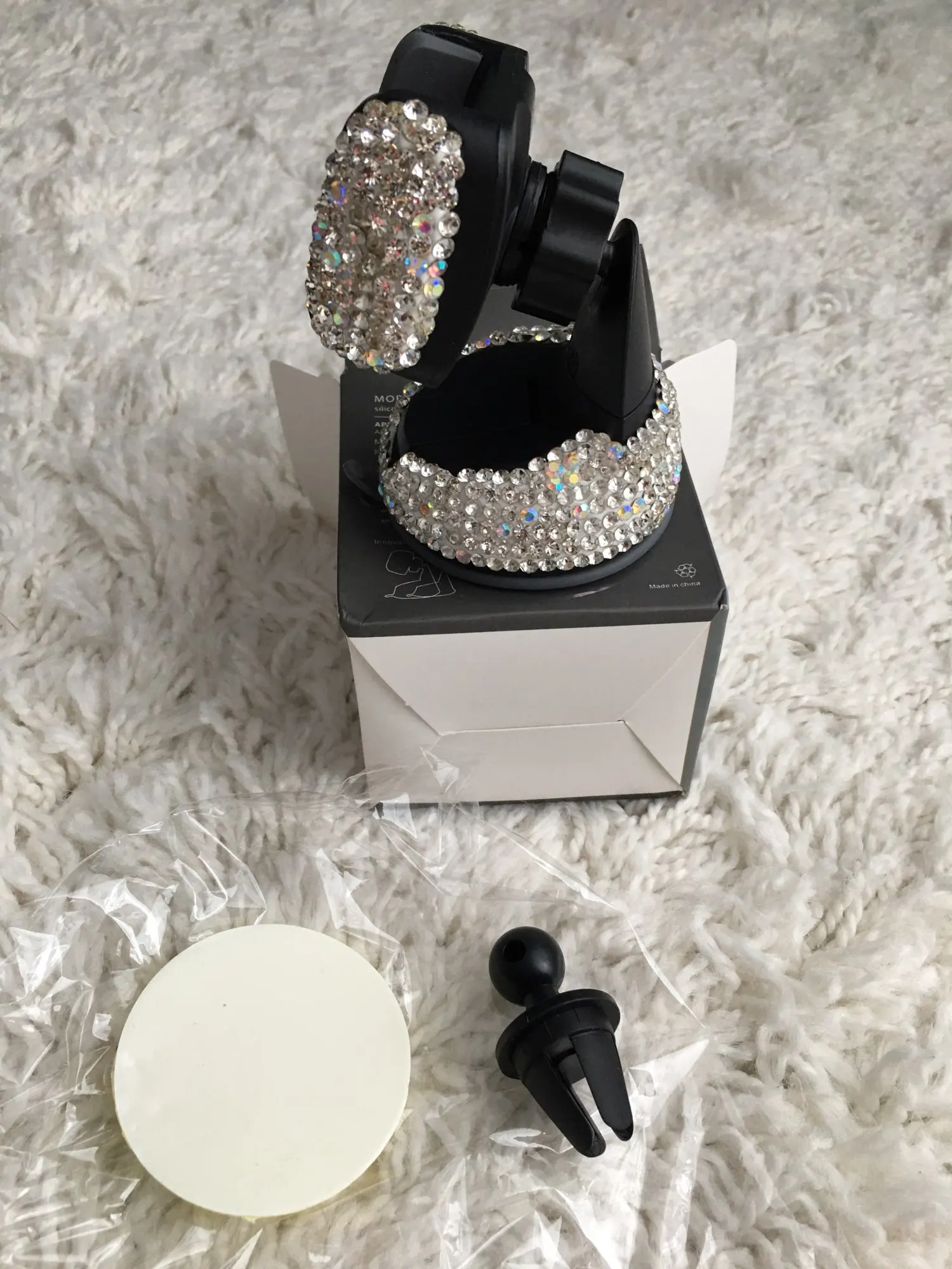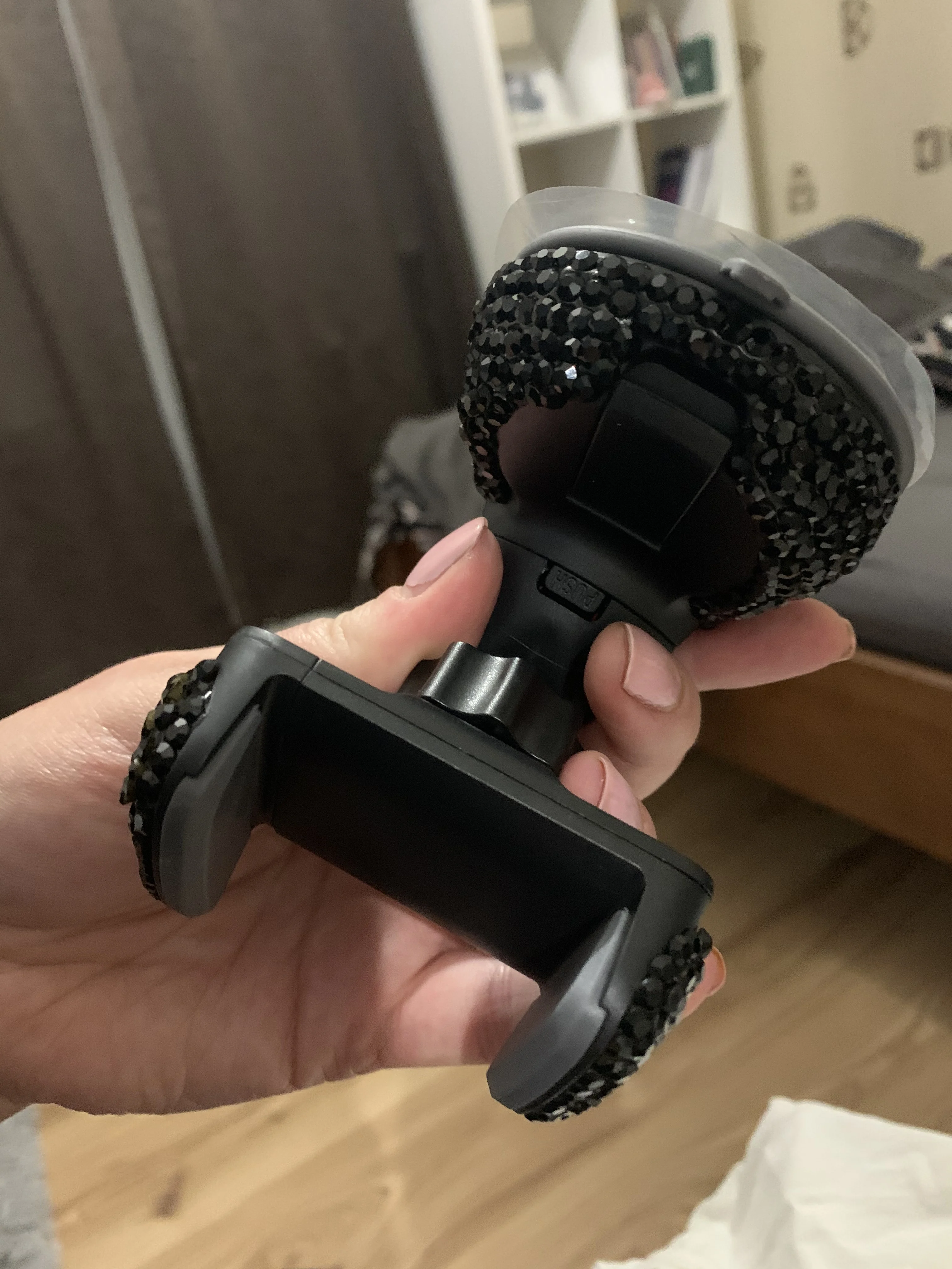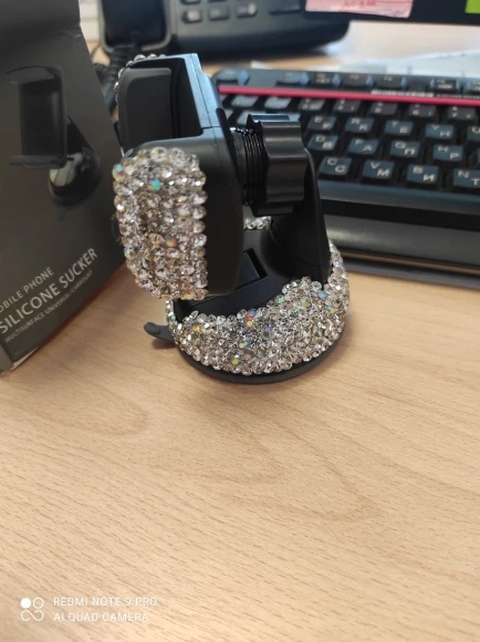 Пришёл прям очень быстро. Упаковали хорошо но коробка все равно помятая. Мистика просто. А ещё такое ощущение что они просто взяли простой держатель и тупо обклеили стразами. Потому что они странно закреплены. Ну да ладно, все равно смотрится очень красиво. Так же специальный рычаг имеется для создания вакуума для присоски и в комплекте дополнительная запасная клейкая основа.