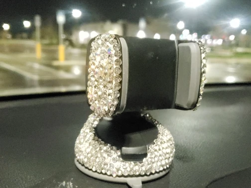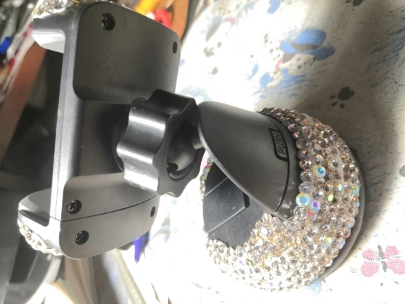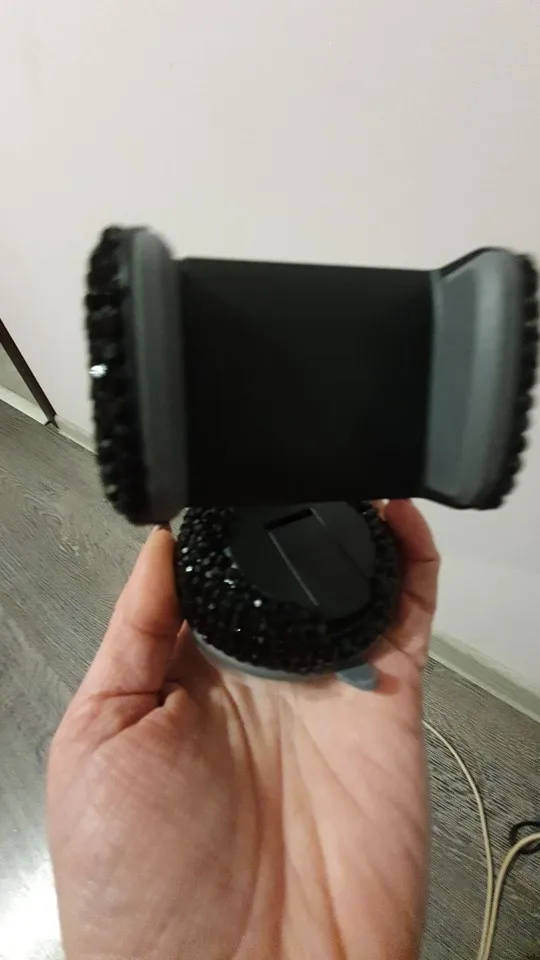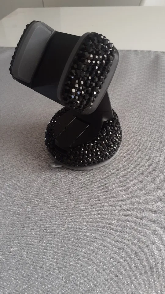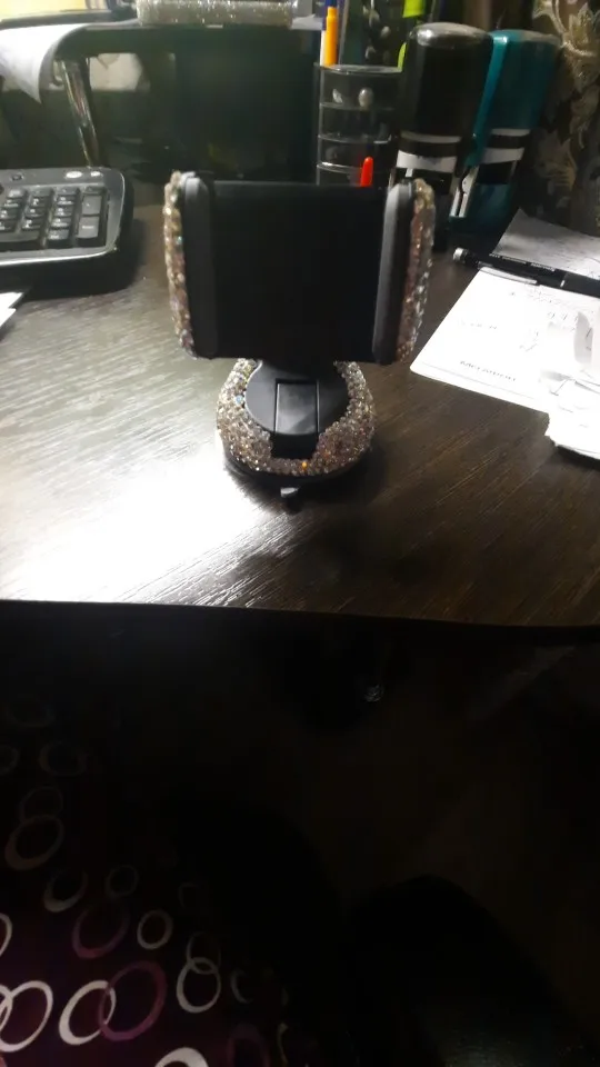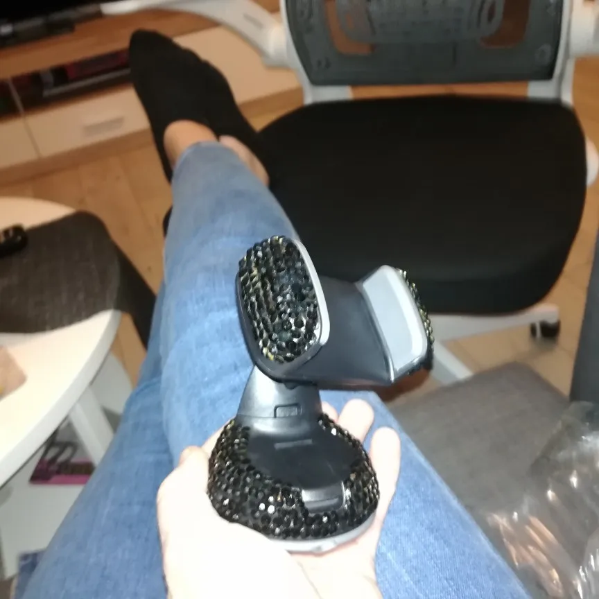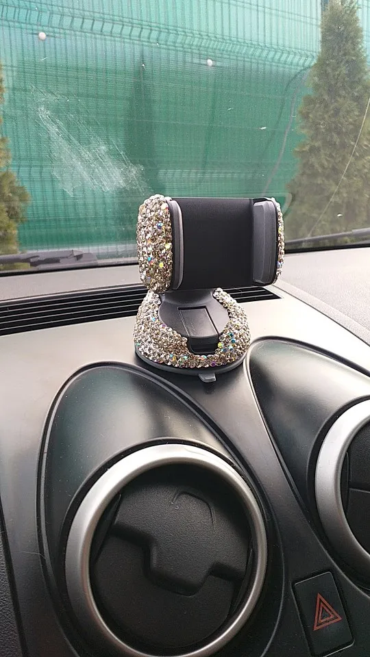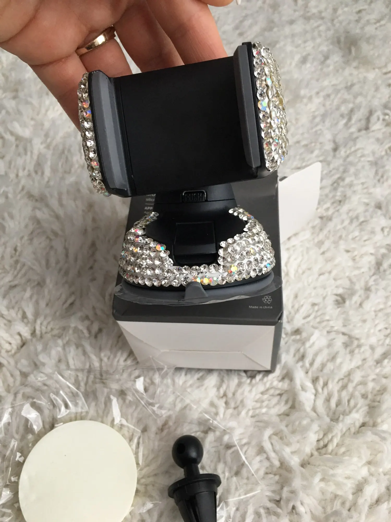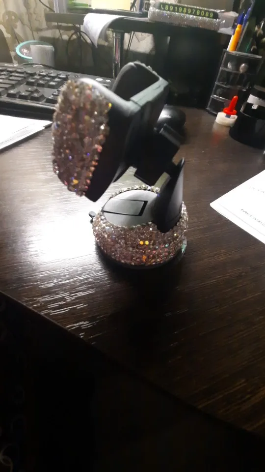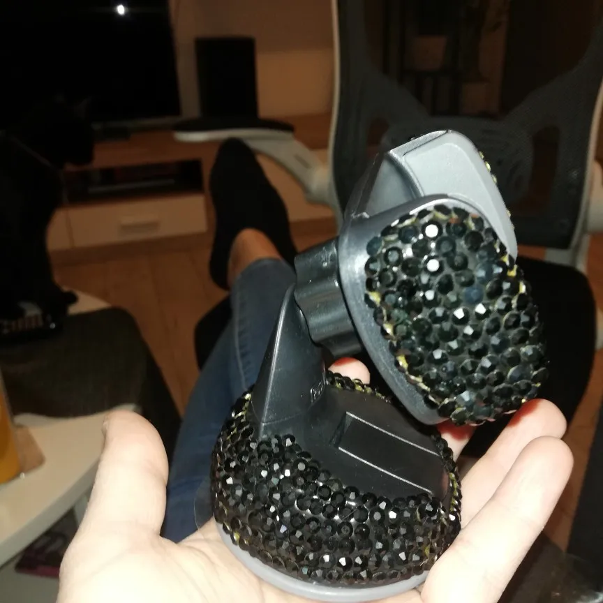 Пришёл прям очень быстро. Упаковали хорошо но коробка все равно помятая. Мистика просто. А ещё такое ощущение что они просто взяли простой держатель и тупо обклеили стразами. Потому что они странно закреплены. Ну да ладно, все равно смотрится очень красиво. Так же специальный рычаг имеется для создания вакуума для присоски и в комплекте дополнительная запасная клейкая основа.