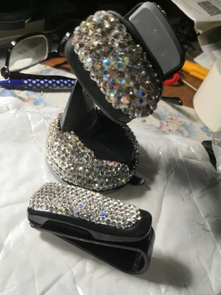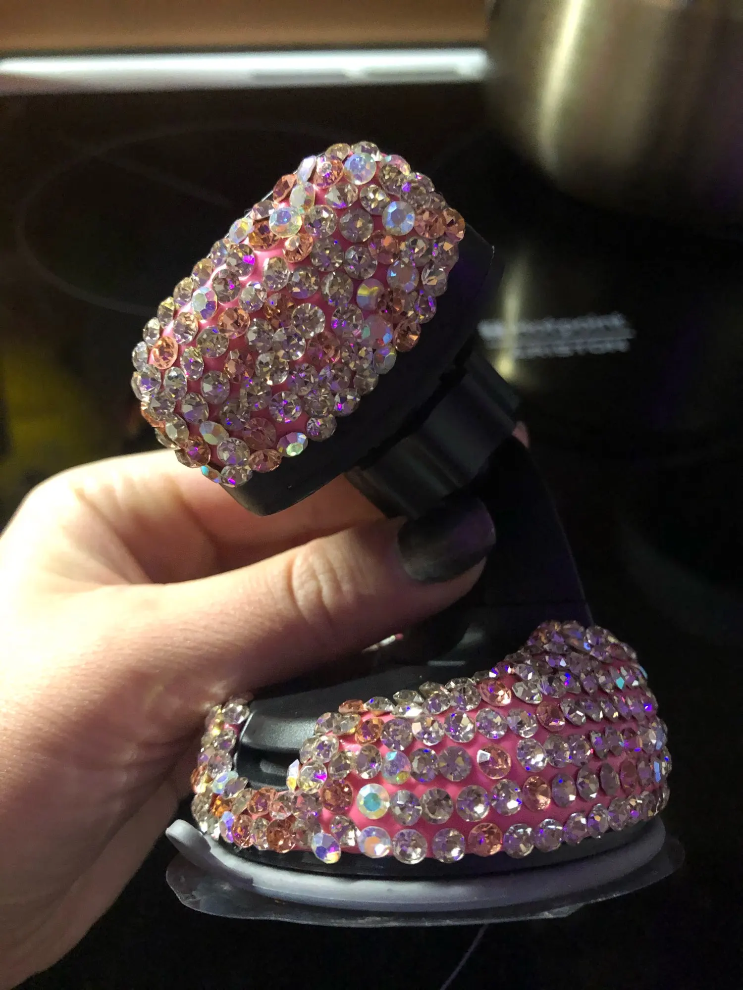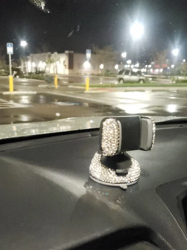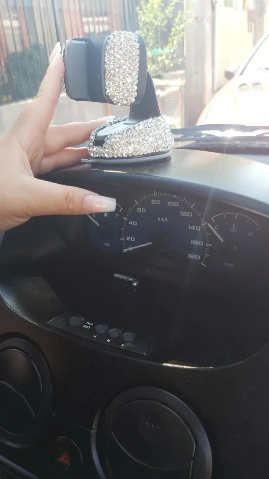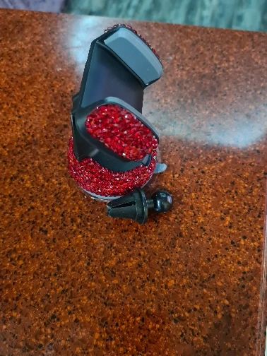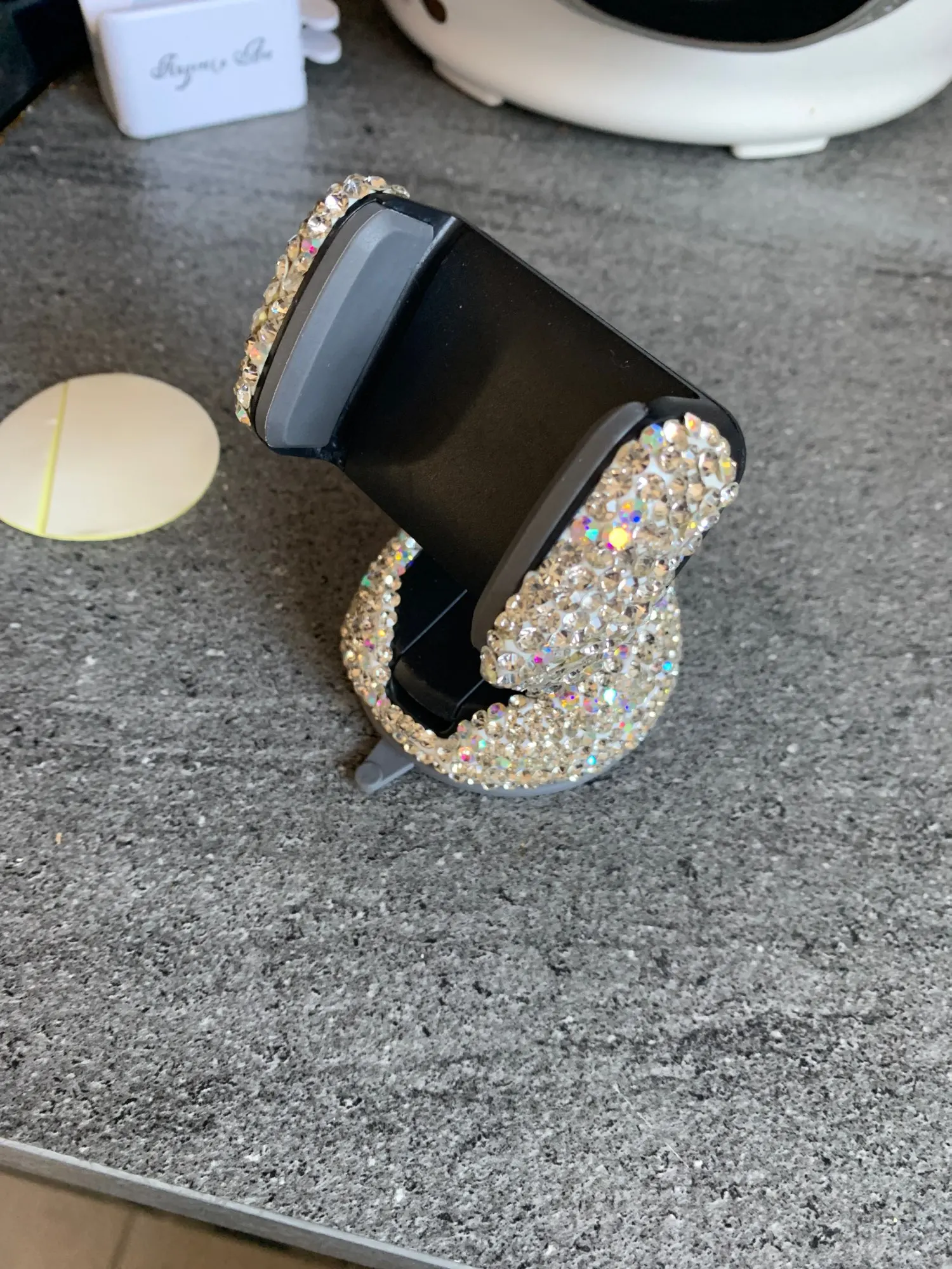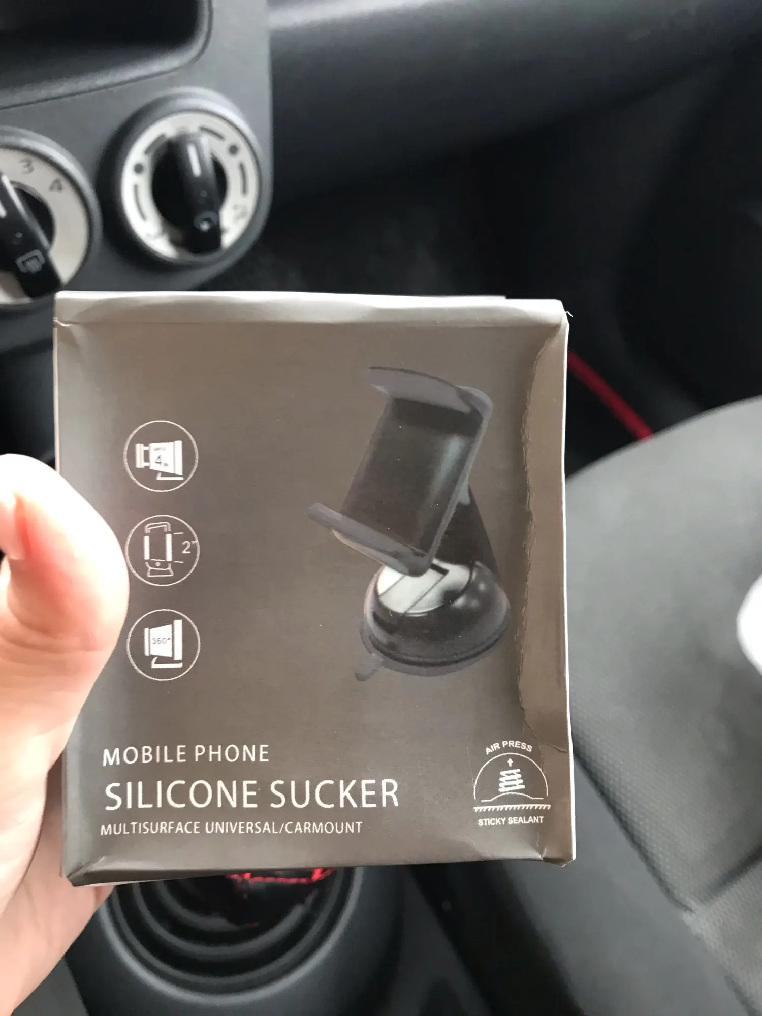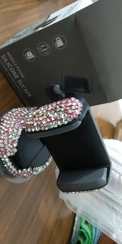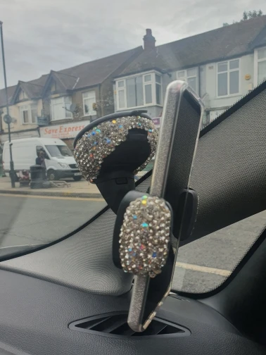 Пришёл прям очень быстро. Упаковали хорошо но коробка все равно помятая. Мистика просто. А ещё такое ощущение что они просто взяли простой держатель и тупо обклеили стразами. Потому что они странно закреплены. Ну да ладно, все равно смотрится очень красиво. Так же специальный рычаг имеется для создания вакуума для присоски и в комплекте дополнительная запасная клейкая основа.