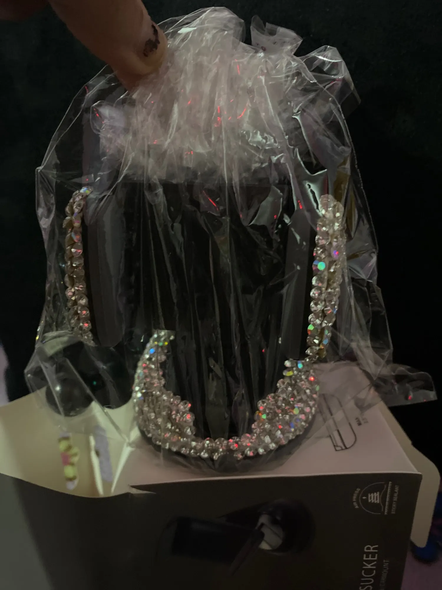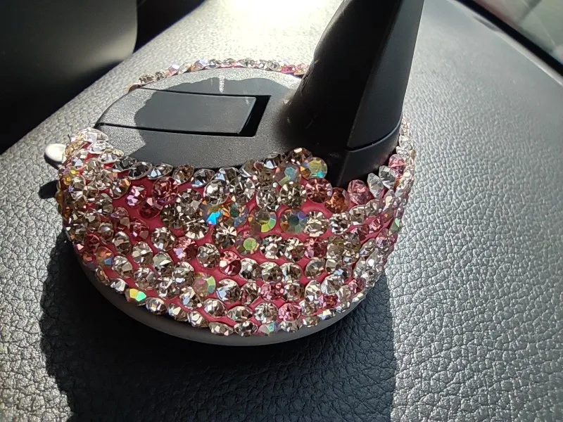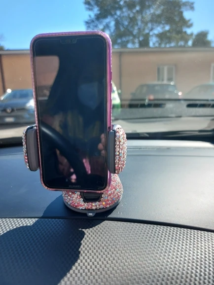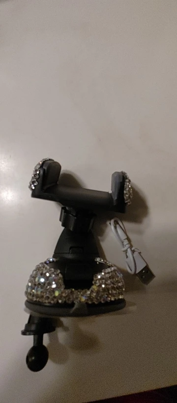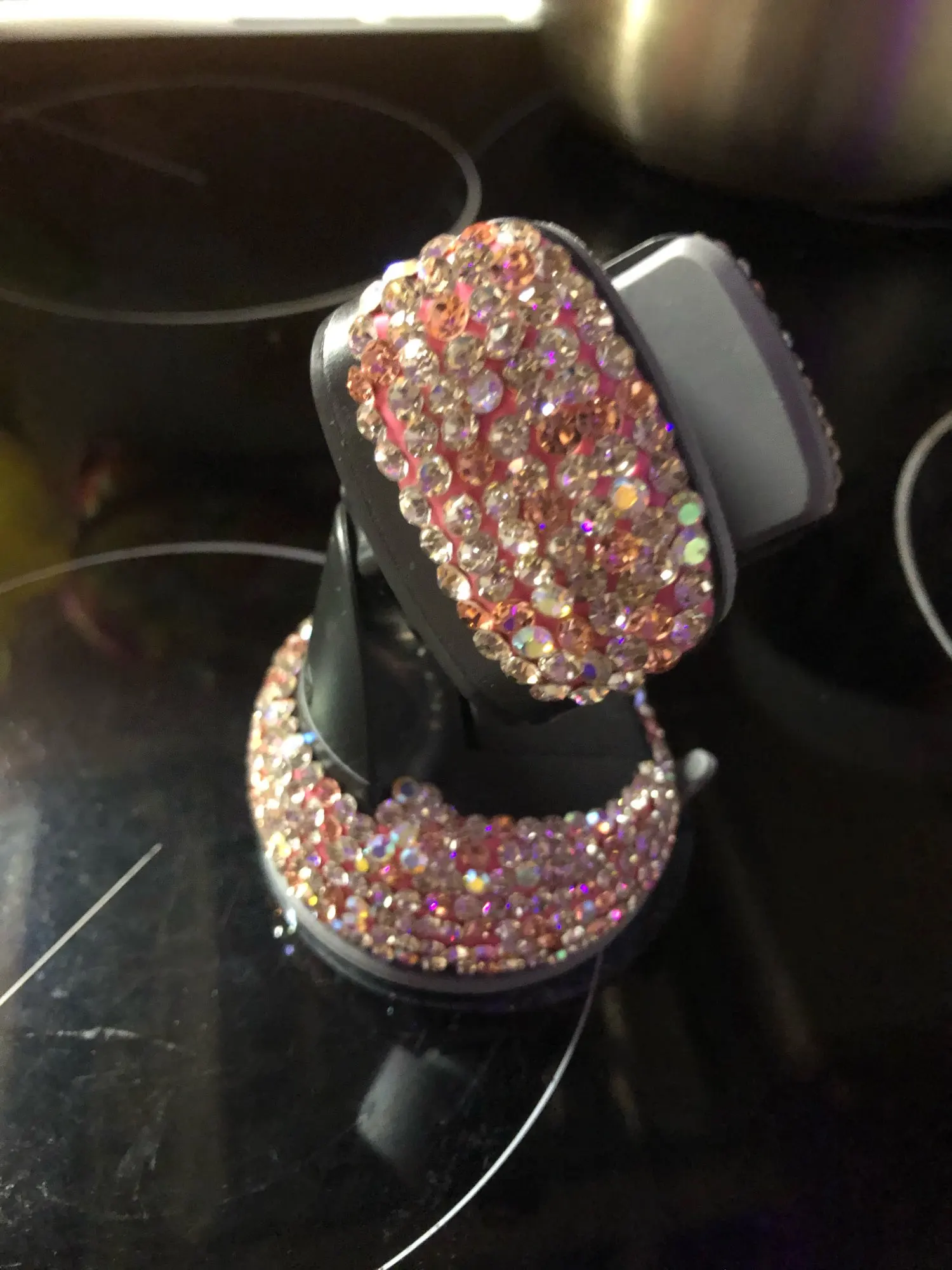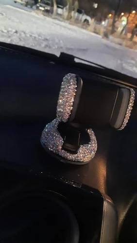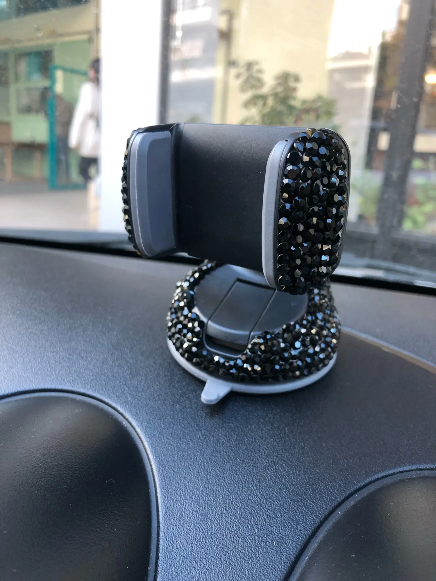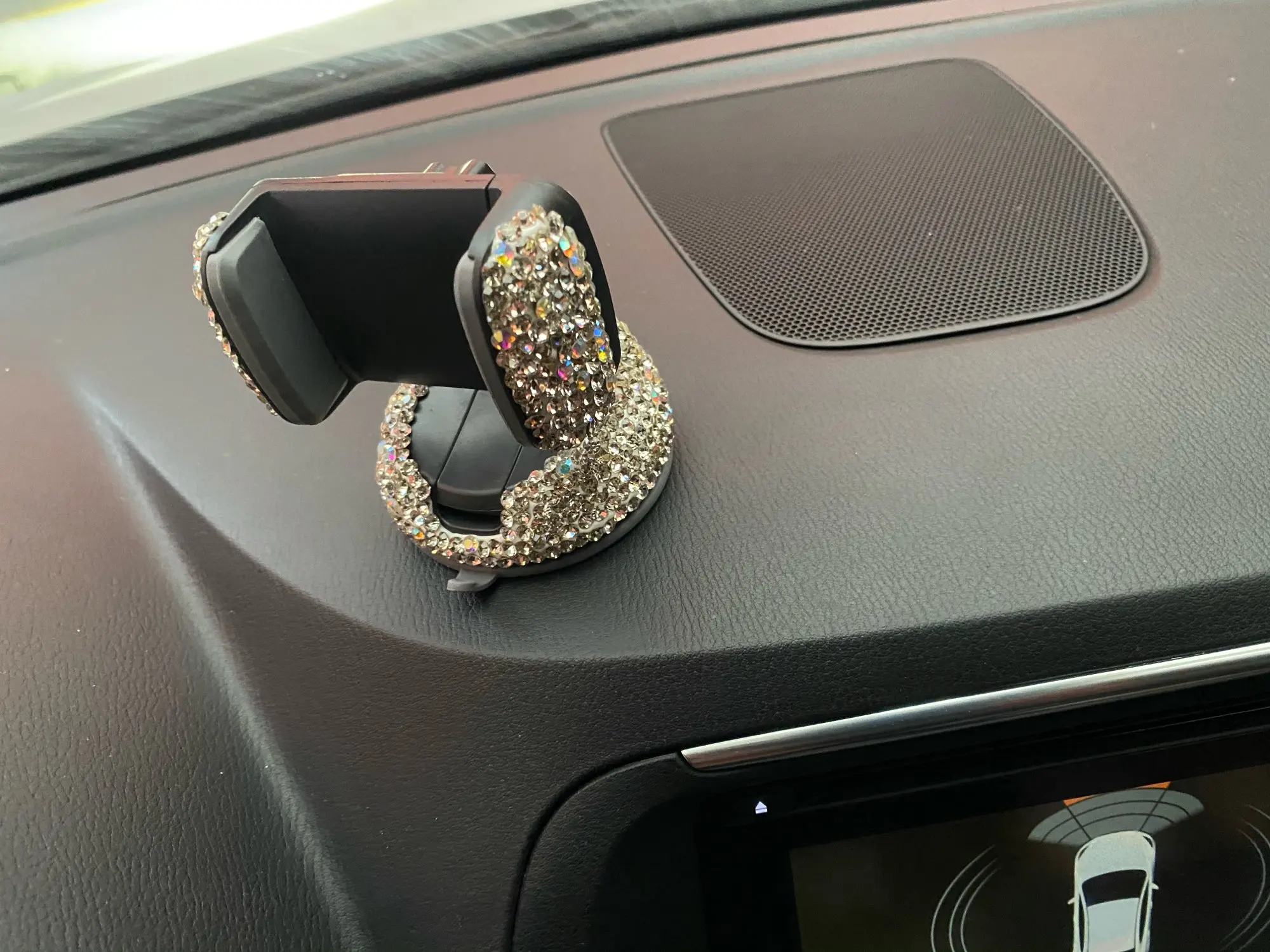 Пришёл прям очень быстро. Упаковали хорошо но коробка все равно помятая. Мистика просто. А ещё такое ощущение что они просто взяли простой держатель и тупо обклеили стразами. Потому что они странно закреплены. Ну да ладно, все равно смотрится очень красиво. Так же специальный рычаг имеется для создания вакуума для присоски и в комплекте дополнительная запасная клейкая основа.
