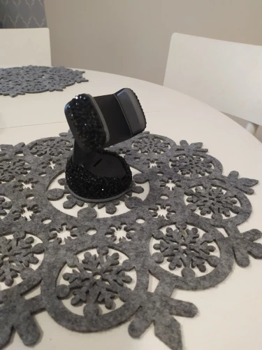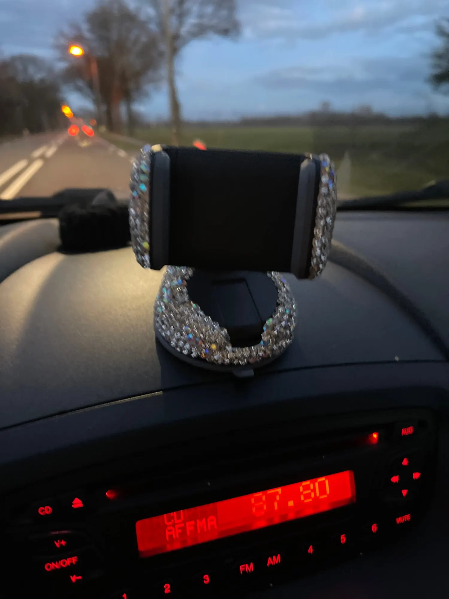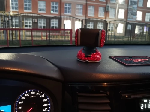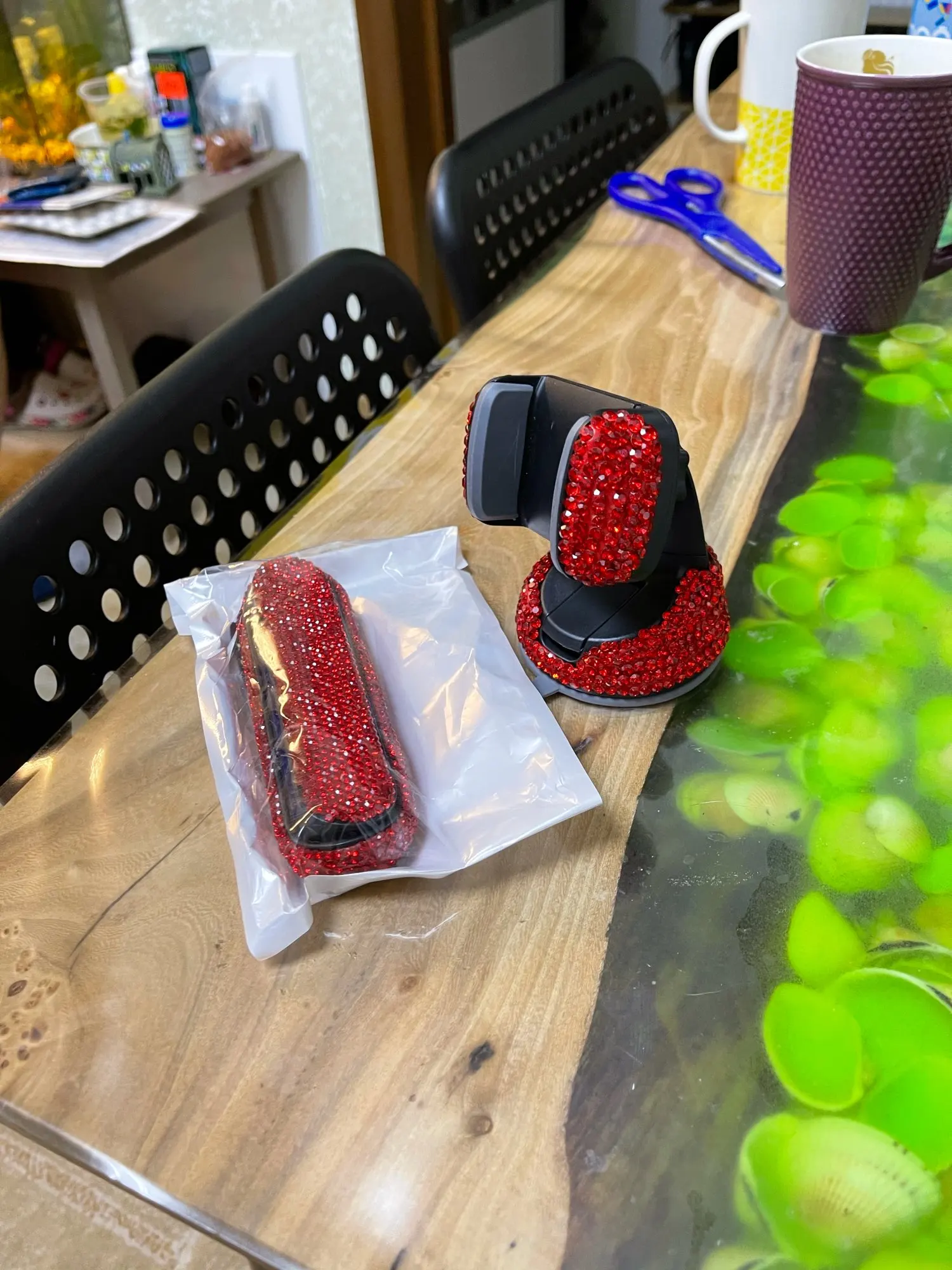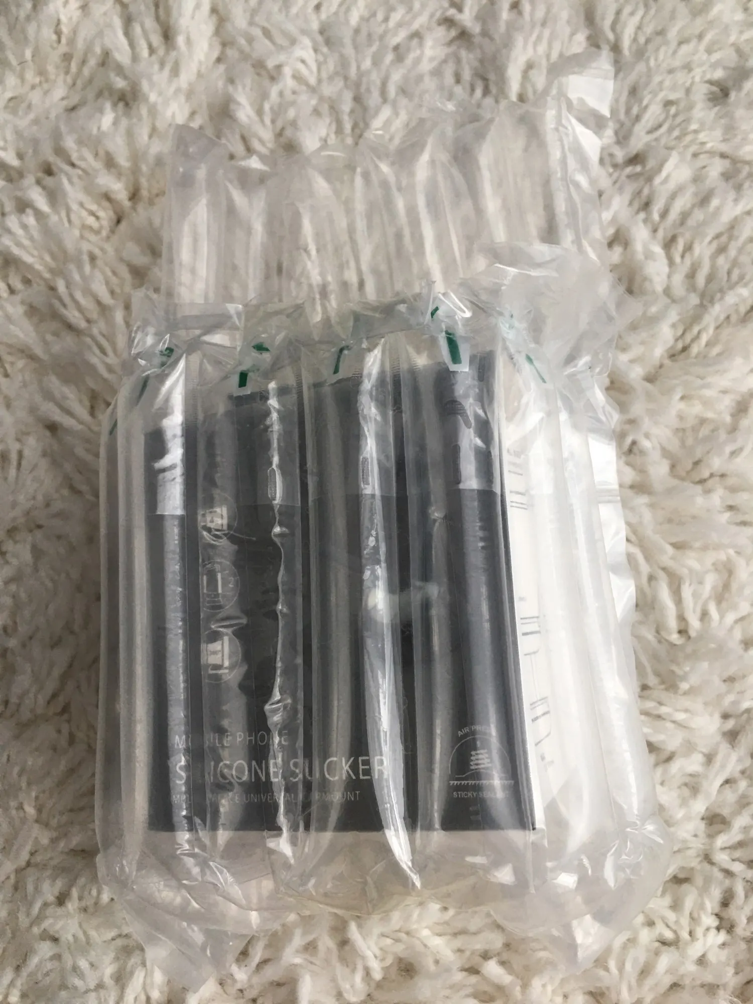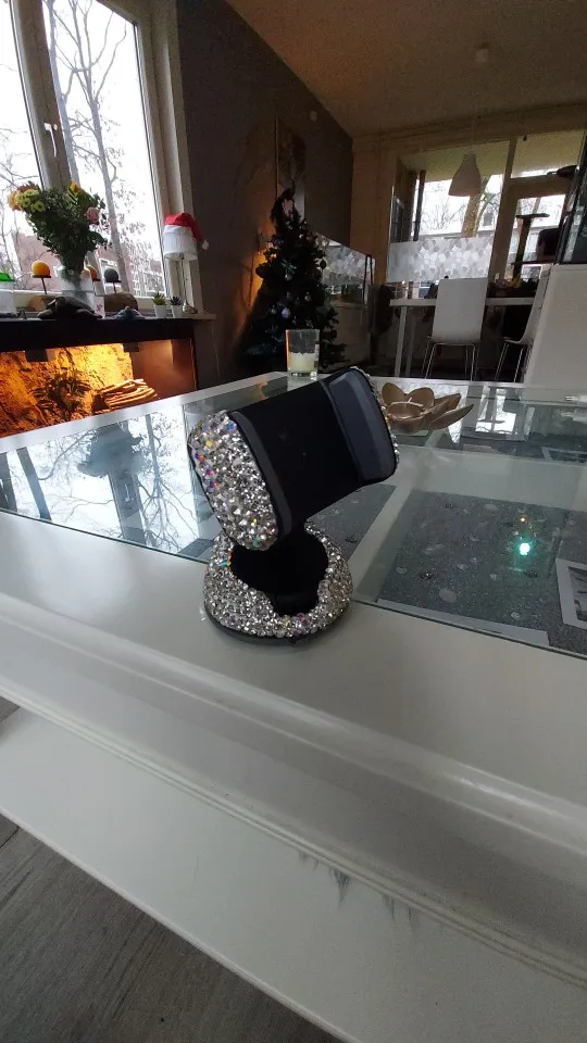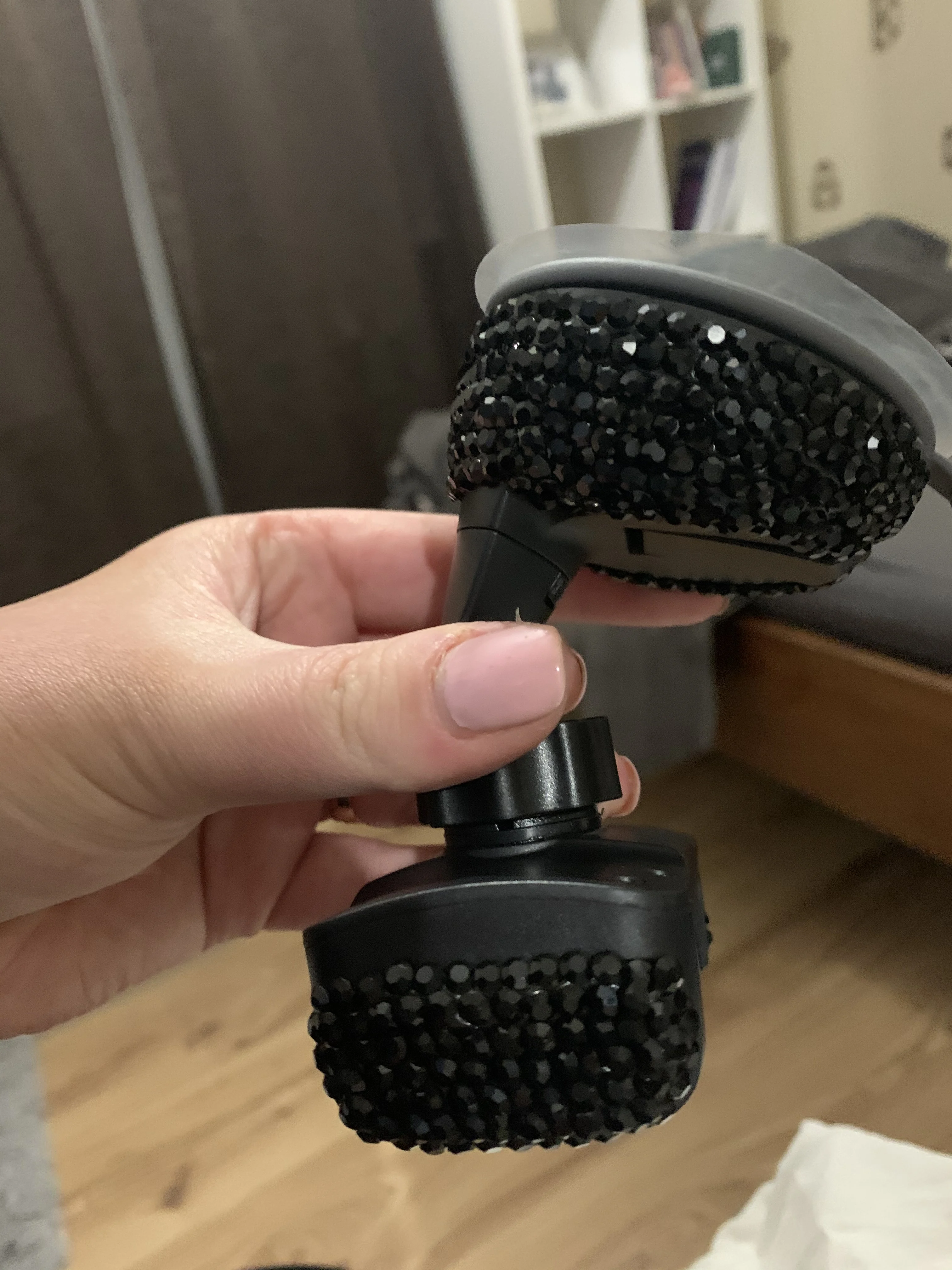 Пришёл прям очень быстро. Упаковали хорошо но коробка все равно помятая. Мистика просто. А ещё такое ощущение что они просто взяли простой держатель и тупо обклеили стразами. Потому что они странно закреплены. Ну да ладно, все равно смотрится очень красиво. Так же специальный рычаг имеется для создания вакуума для присоски и в комплекте дополнительная запасная клейкая основа.