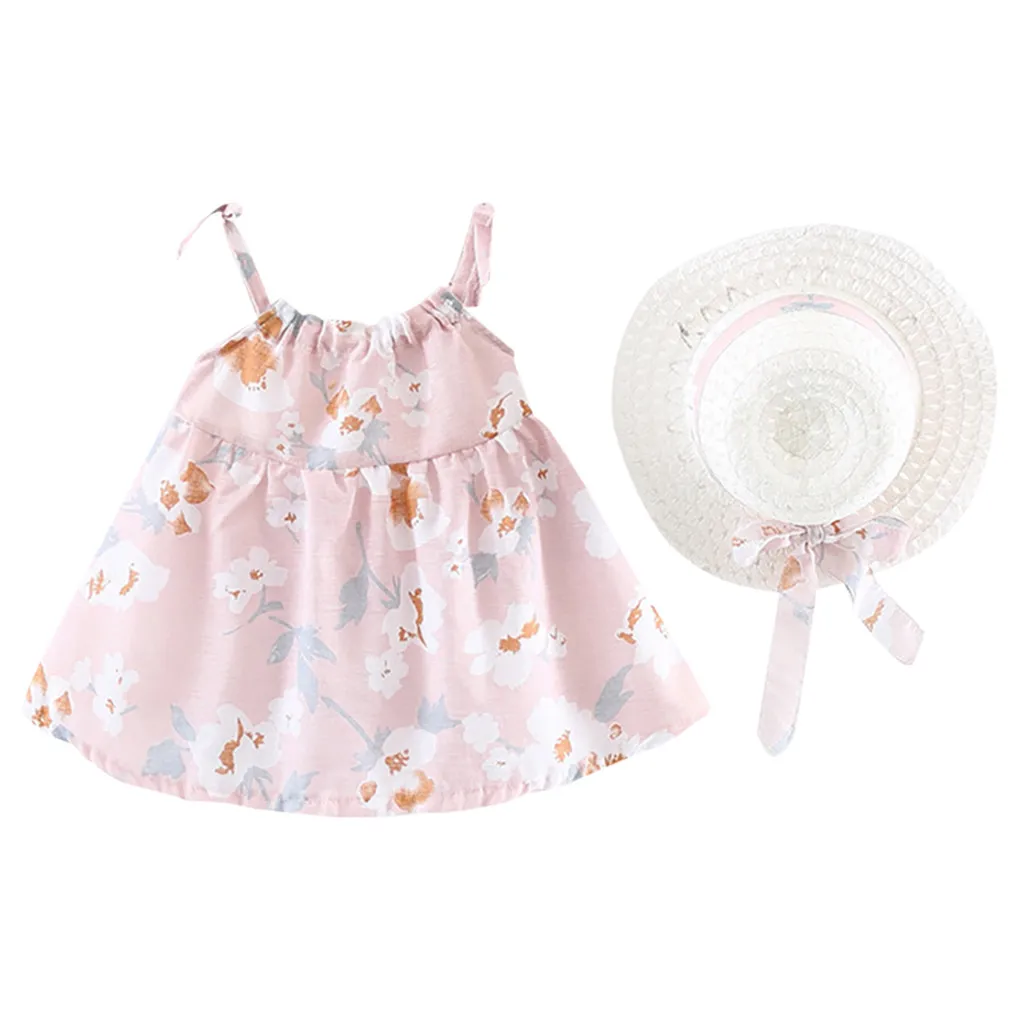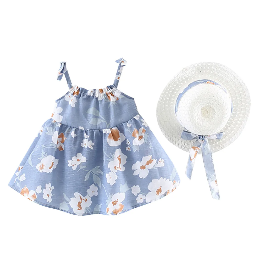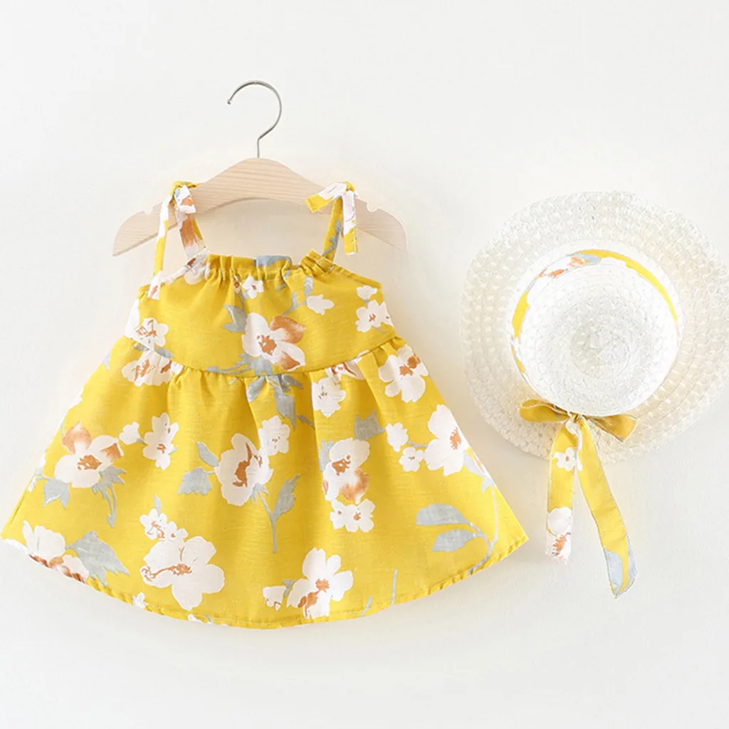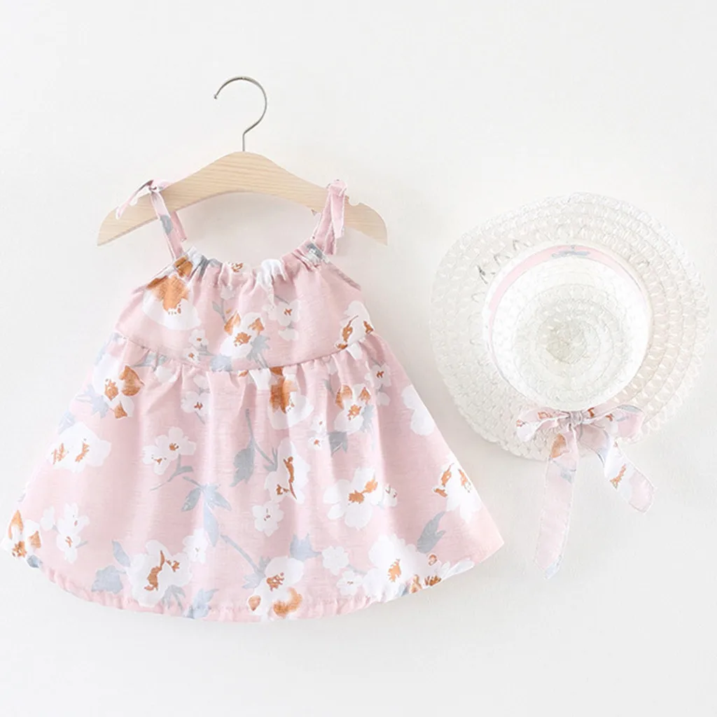 Платье для маленьких девочек, платья без рукавов с цветами для новорожденных, одежда для маленьких девочек, платье принцессы с цветочным принтом + комплект одежды с шапочкой