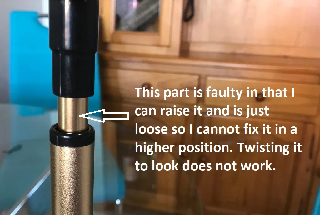 Эта часть неисправна и не затягивается, поэтому она не может быть поднята и не блокируется на месте, поэтому рука просто вращается. Магазин не сказал мне об этом сразу после отправки по электронной почте, поэтому я должен был оставить им плохой отзыв. Это не очень удобно для бизнеса, и я отправил им эту фотографию, чтобы четко объяснить проблему. Я обновлю этот спор, если они это решат.