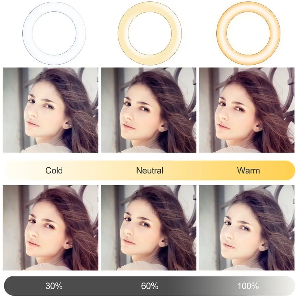 2. Затемненный светодиодный 6 " /8" кольцевой светильник-он имеет 3 вида цветов светильник ing режим: белый, теплый желтый, и теплый белый свет. Каждый светильник ing имеет 10 регулируемых режимов яркости на выбор, простое управление шнуром для включения/выключения питания или переключение на светильник, который вы хотите, этот кольцевой светильник делает все фото и видео более профессиональными.