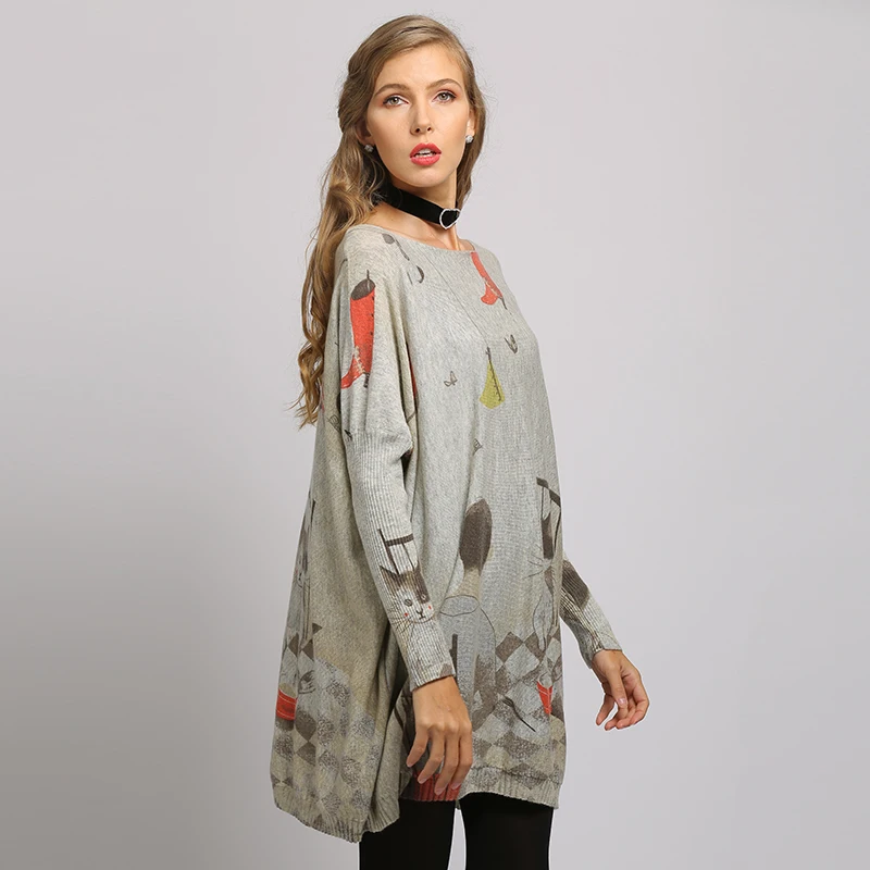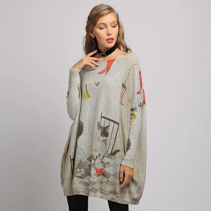 Длинный женский свитер XIKOI большого размера, повседневное пальто с рукавом летучая мышь, женские свитера с принтом кота, одежда, пуловеры, вязаное платье с круглым вырезом