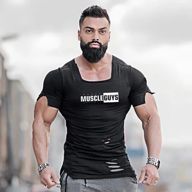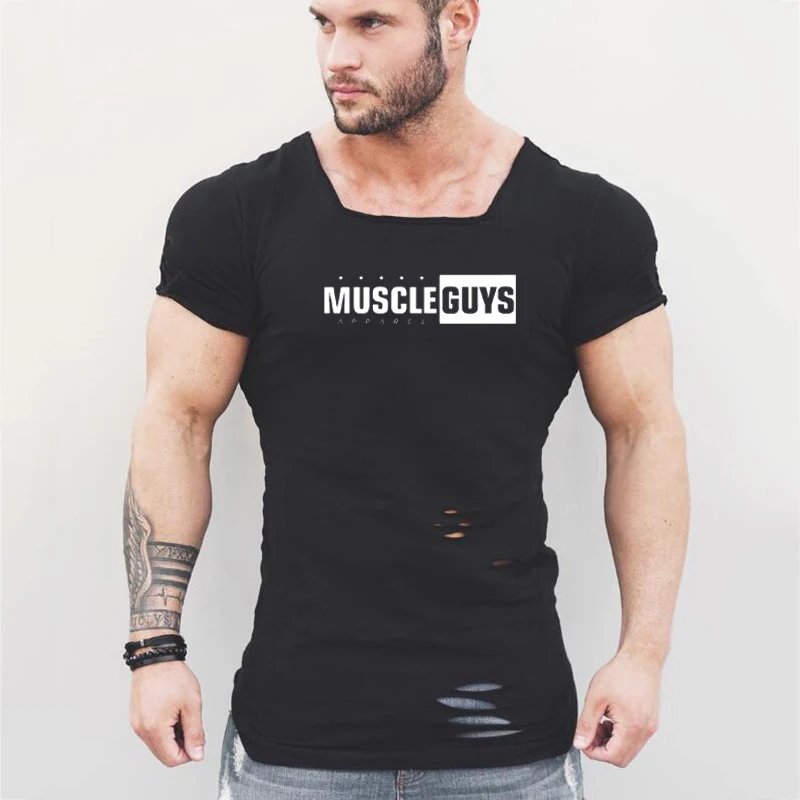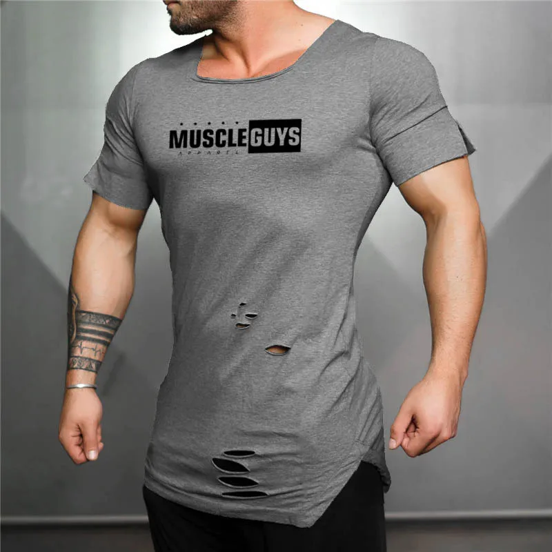 Летние мужские футболки, модные, с коротким рукавом, для фитнеса, мужские тренировки, облегающие, рваные, хлопковые футболки, топы