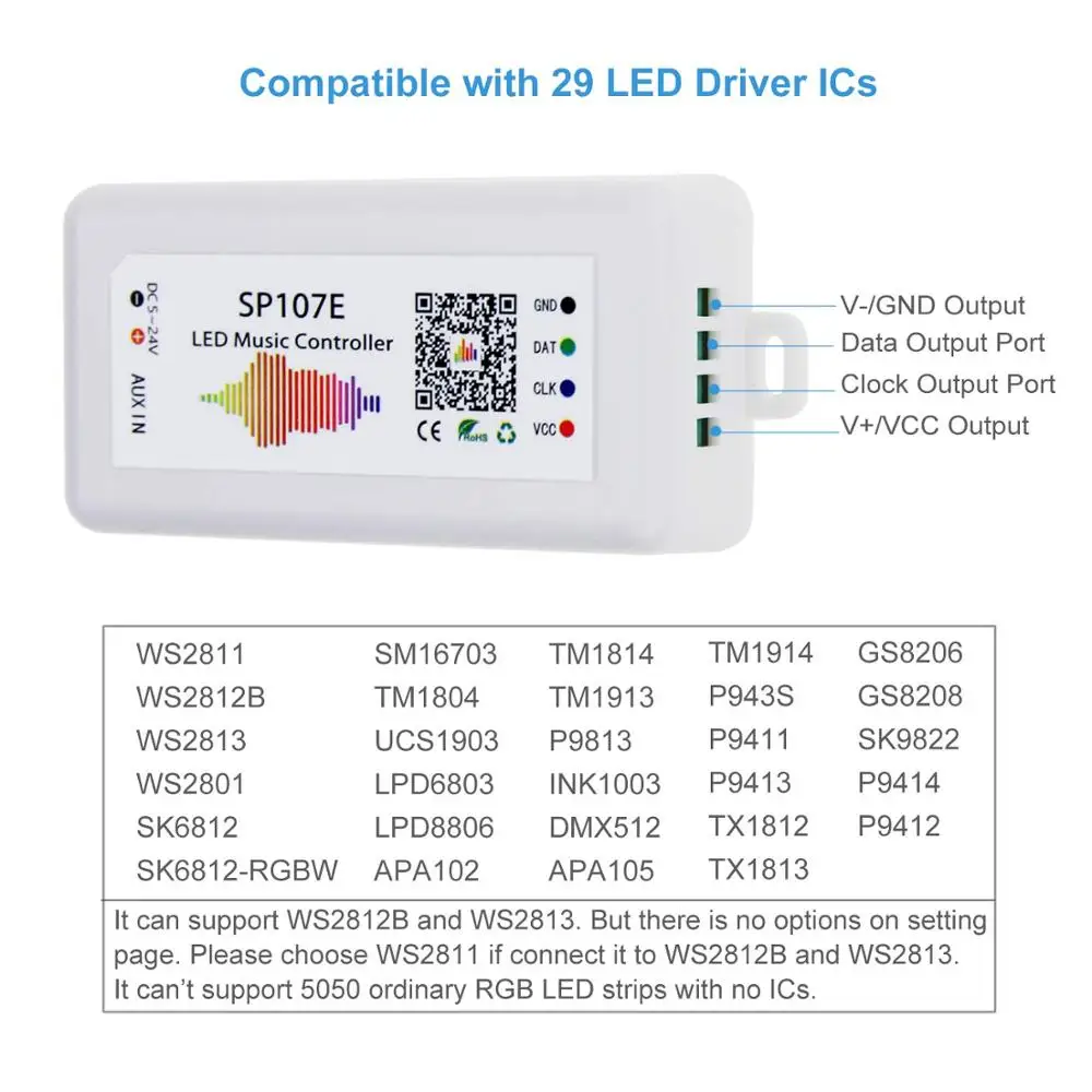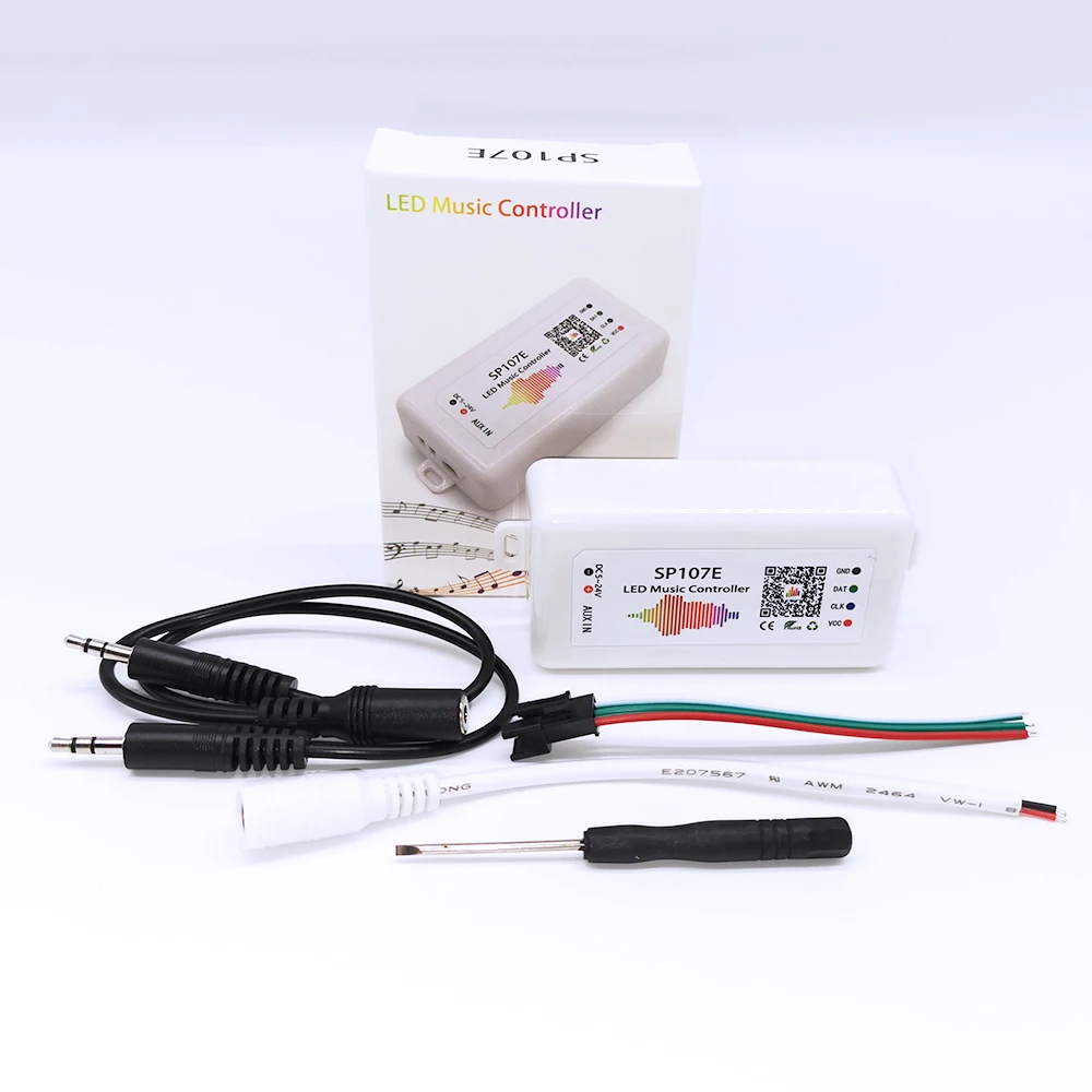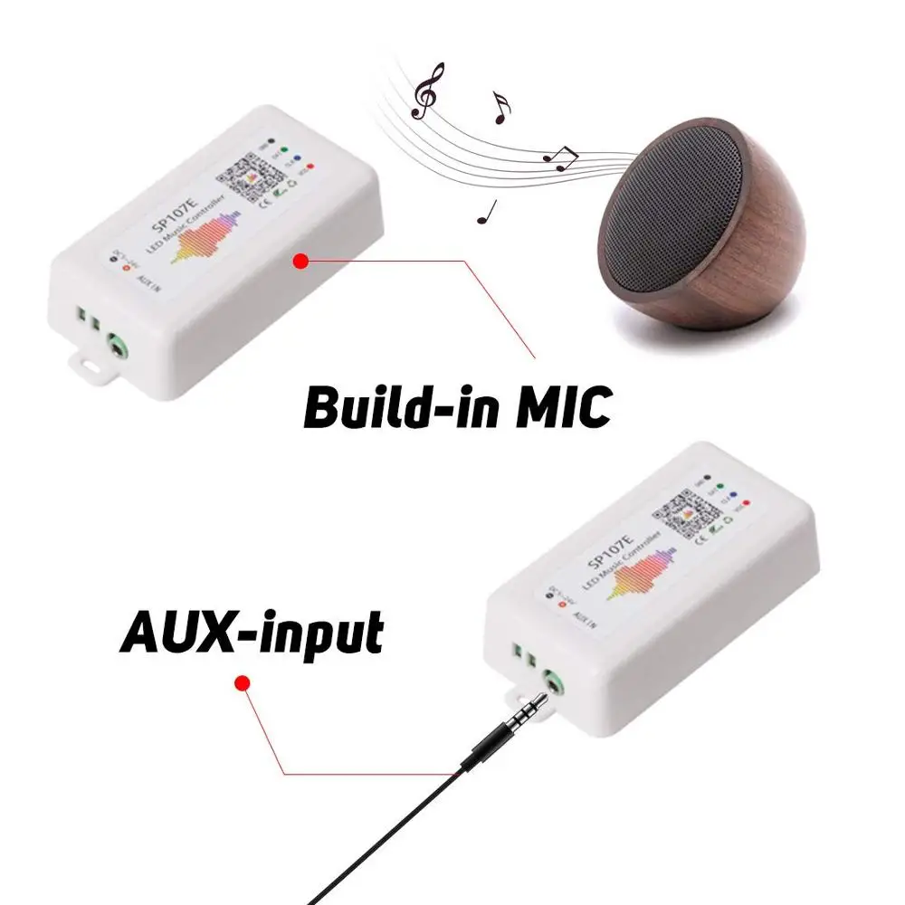 Есть два способа ввода аудиосигнала НА SP107E, вход AUX и встроенный микрофон;Вход AUX: Подключите кабель аудиоразветвителя к разъему «AUX IN», подключите источник аудиовыхода (MP3, телефон или планшет...) и динамик (или гарнитуру), контроллер автоматически переключится в режим ввода AUX;Микрофон: отсоедините аудиокабель, контроллер автоматически переключится в режим ввода микрофона.4. Меры предосторожности:(1). Контроллер может поддерживать 5 В ~ 24 В постоянного тока, но он не может регулировать выходное напряжение на VCC. Это означает, что выходное напряжение вашего источника питания должно быть таким же, как и рабочее напряжение ваших светодиодных ламп. Если рабочее напряжение светодиодный светильник да составляет 5 В, пожалуйста, используйте источник питания 5 В, никогда не используйте источник питания 12 В или 24 В. В противном случае весь светодиодный индикатор будет разрушен.(2). Пожалуйста, используйте источник питания, а не аккумулятор для питания контроллера. Выходная мощность источника питания должна быть больше, чем Максимальная мощность светодиодсветильник. Например, если рабочее напряжение и максимальный усилитель светильник льника составляет 5 В, 10 А, 50 Вт, выходная мощность источника питания должна быть не менее 5 В, 10 А, 50 Вт. В противном случае не будет работать плавно.(3). Контроллер поддерживает только светодиодные фонари со smart IC. Не поддерживает обычную светодиодную ленту RGB/RGBW без IC.5. Что вы можете сделать, если не можете заставить его работать?Пожалуйста, проверьте ваш смартфон и светодиодные лампы и подтвердите, поддерживают ли они контроллер. Ваш смартфон должен быть IOS 10,0 или Android 4,4 или более поздней версии.Пожалуйста, проверьте выходное напряжение и усилитель вашего источника питания и подтвердите, соответствует ли он контроллеру и светодиодным индикаторам. Если светильник 5 В, используйте источник питания 5 В. Никогда не используйте Питание 12 В. В противном случае светодиодные лампы будут повреждены.Если блок питания, контроллер и светодиодные лампы могут быть совместимы друг с другом, Пожалуйста, подключите их и настройте снова, следуя инструкциям по подключению и настройке выше.Установите достаточное количество пикселей, правильную последовательность RGB и тип ИС. В противном случае они не смогут работать плавно.Если вам нужна дополнительная помощь, свяжитесь с нами напрямую. Мы решим проблему в течение 12 часов.