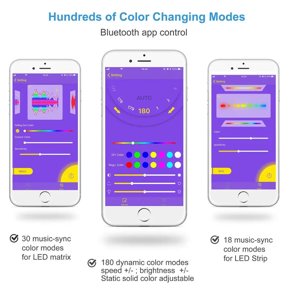 С 18 видами светодиодных музыкальных эффектов, 30 видами светодиодных матричных музыкальных эффектов и 180 видами немузыкальных эффектов; Цветовой оттенок, яркость и скорость регулируются;