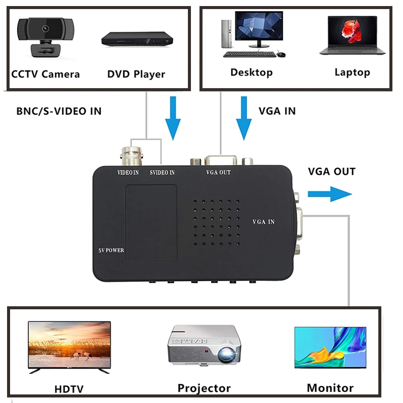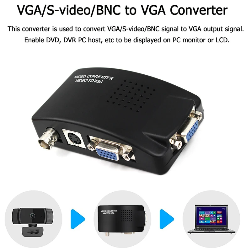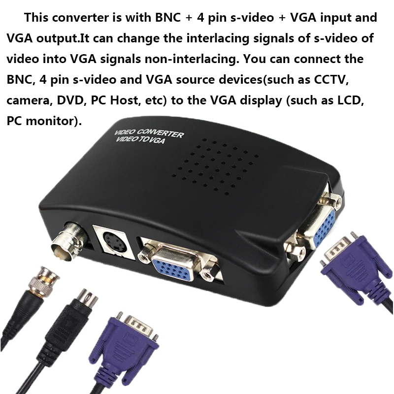 Этот видео конвертер с BNC/VGA/S-видео входами и VGA выходом, который преобразует VGA/S-видео/BNC сигналы в VGA дисплей сигнала. Сигнал легко переключается между различными входными источниками.
