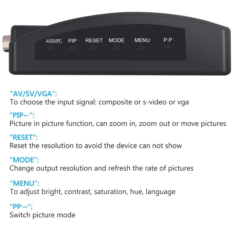 4. Особенности продукта:1.VGA, 4 pin S-video, BNC in; VGA out. Преобразование VGA/S-video/BNC в VGA. Включите DVD/DVR, замкнутое телевидение, камеру и т. Д. Для отображения на мониторе ПК или ЖК-дисплее. Одна кнопка для легкого переключения между разными входными источниками. Кнопка «вход», «Меню», «замораживание/+», «разрешение/-». Регулируемый вход, яркость, контракт, насыщенность и оттенок. Функция замораживания изображения. Функция OSD (On-Screen-Display). Автоматическое Сохранение настроек и рабочее состояние при выключении питания.