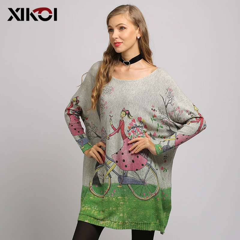 Свитер XIKOI женский оверсайз, длинный пуловер с рукавом летучая мышь, вязаный модный Свободный Повседневный с круглым вырезом, одежда с цветочным принтом для девушек