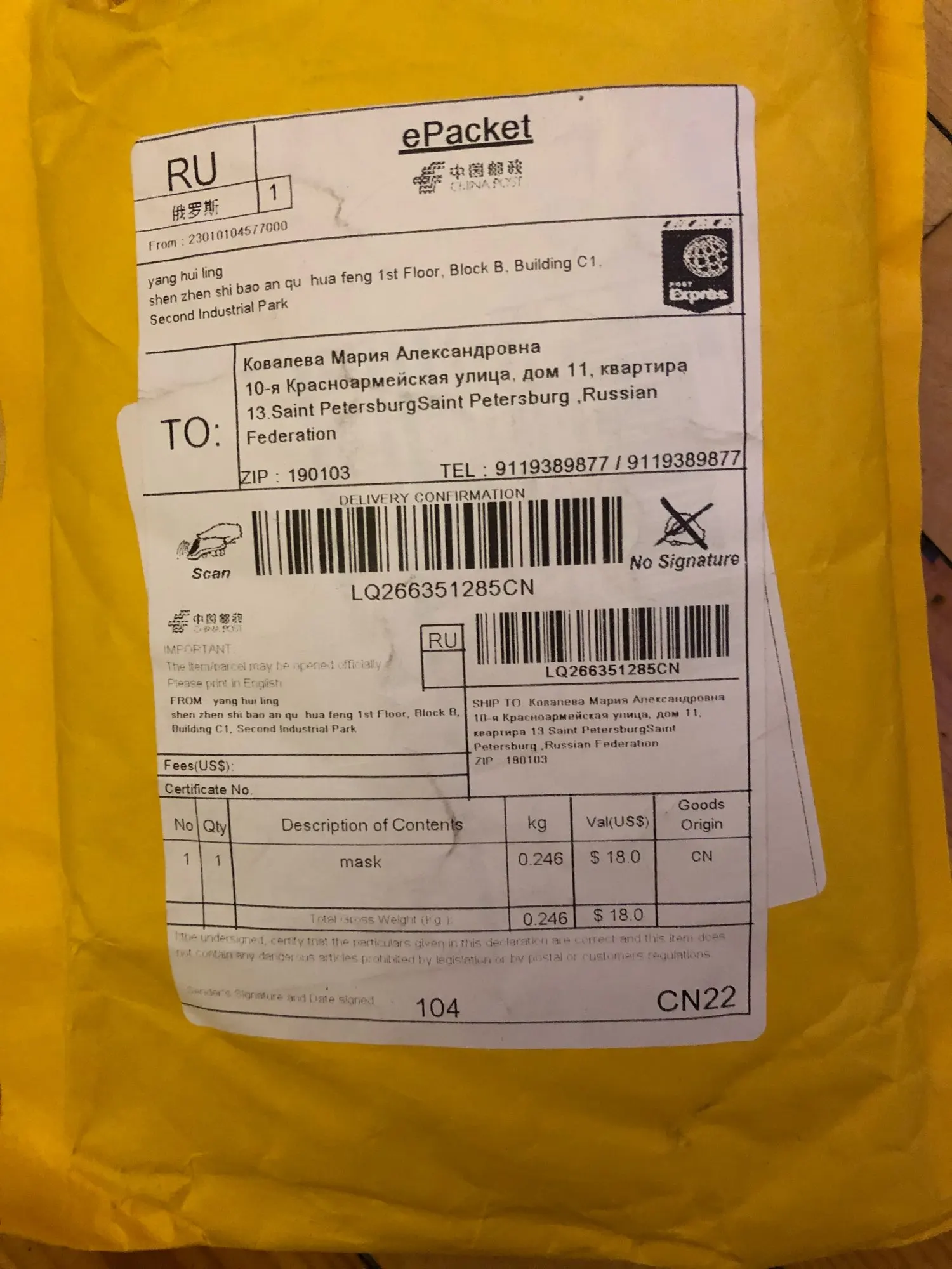Страна: LT Доставка: Cainiao Super Economy Global 11.02.2021