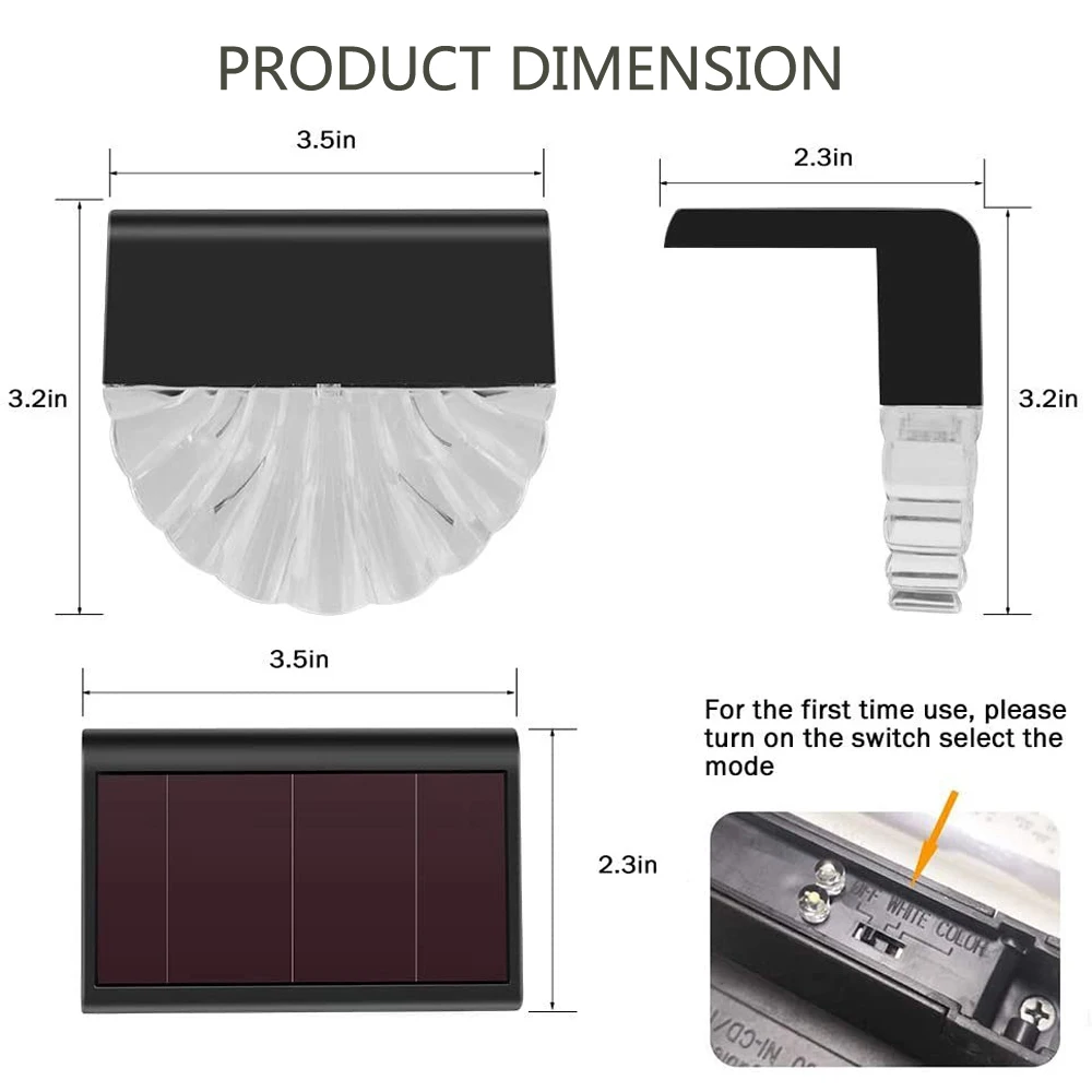 1. Солнечная панель: 1,2 В. 2. Батарея: 1,2 В. 800 мАч, 18650 литиевая батарея. 3. Светодиодный: RGB. 4. Размер: 9*8*6 см. 5. Светодиодный Цвет: 7 цветов. 6. Способ установки: винты. 7. Материал: АБС + Поликарбонат. 8. Время работы: может работать более 4-12 часов. 9. Водонепроницаемость: IP65.