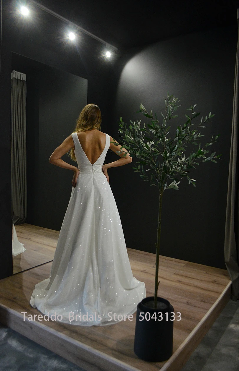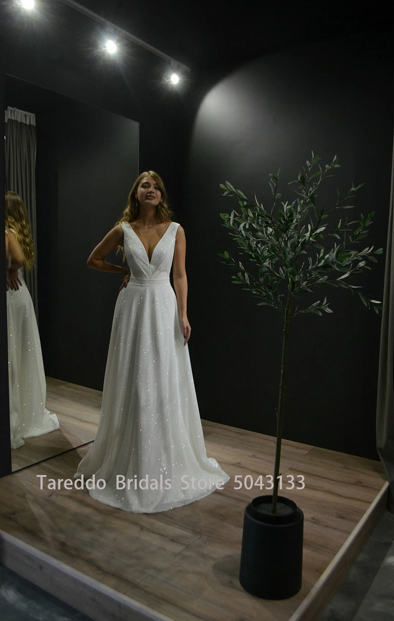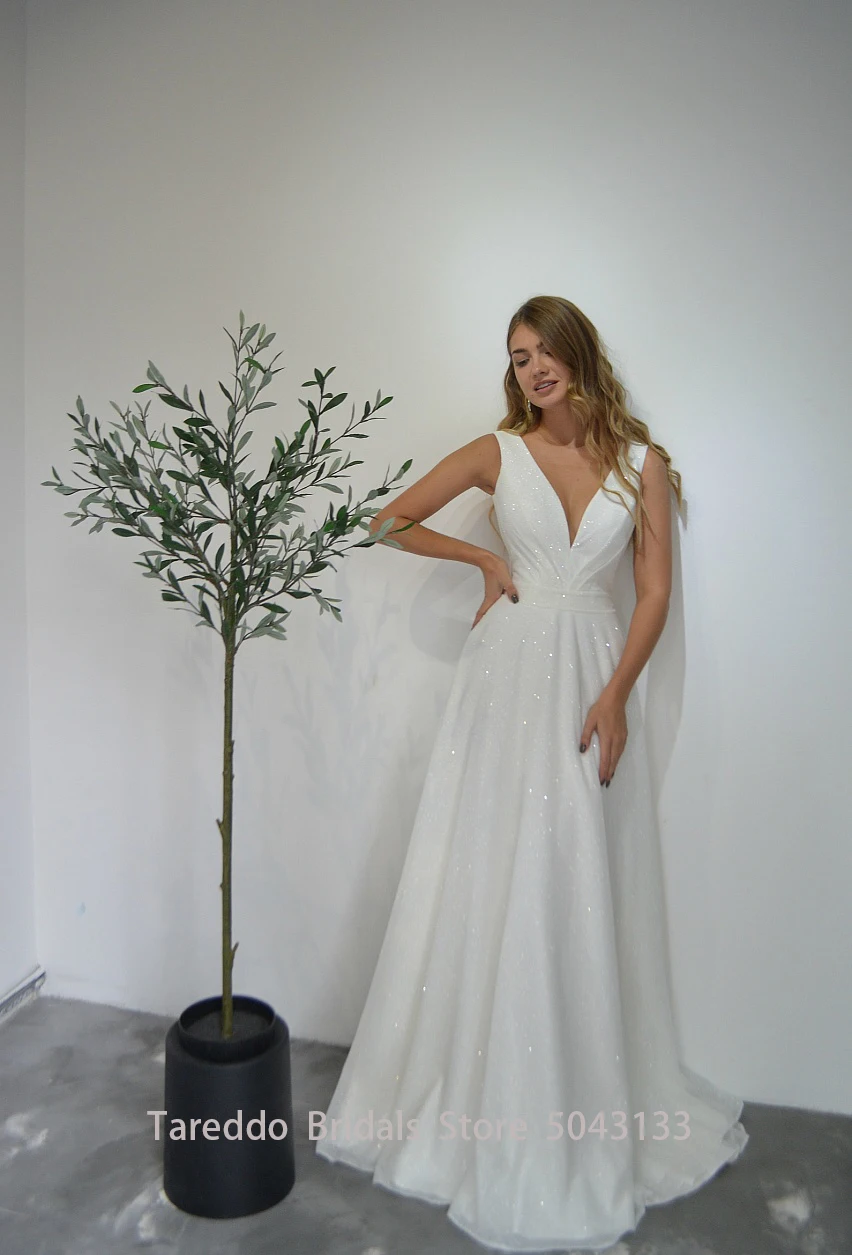 Потрясающие блестящие свадебные платья а-силуэта с глубоким V-образным вырезом и открытой спиной, длинные плиссированные блестящие свадебные платья 2022