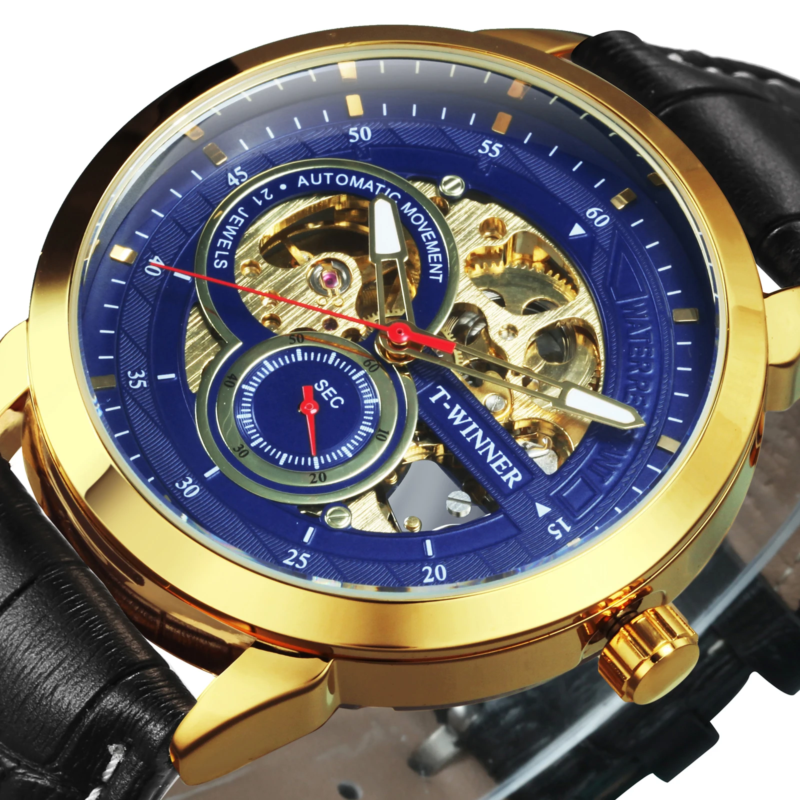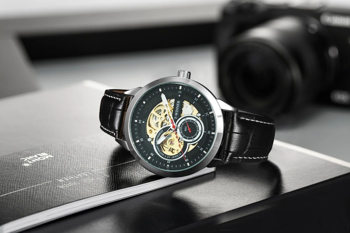 Победитель официальные автоматические механические часы для мужчин Скелет Мужские часы Топ бренд Роскошный кожаный ремешок аналоговые наручные часы для мужчин