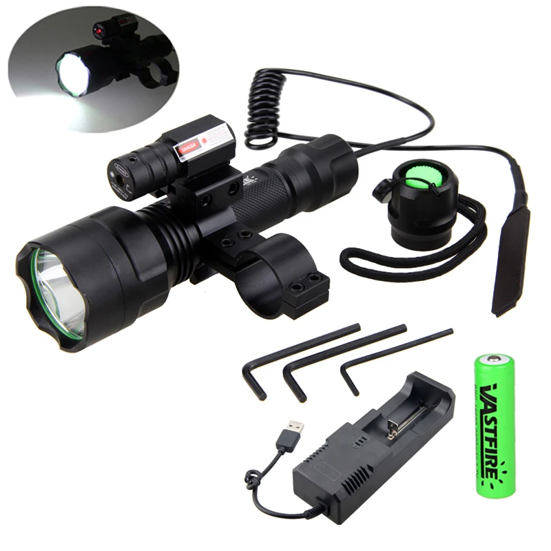Светодиодная тактическая вспышка для охотничьего оружия, светильник для винтовки страйкбола + лазерный точечный прицел + переключатель давления + 20 мм рельсовое крепление + 18650 + зарядное устройство