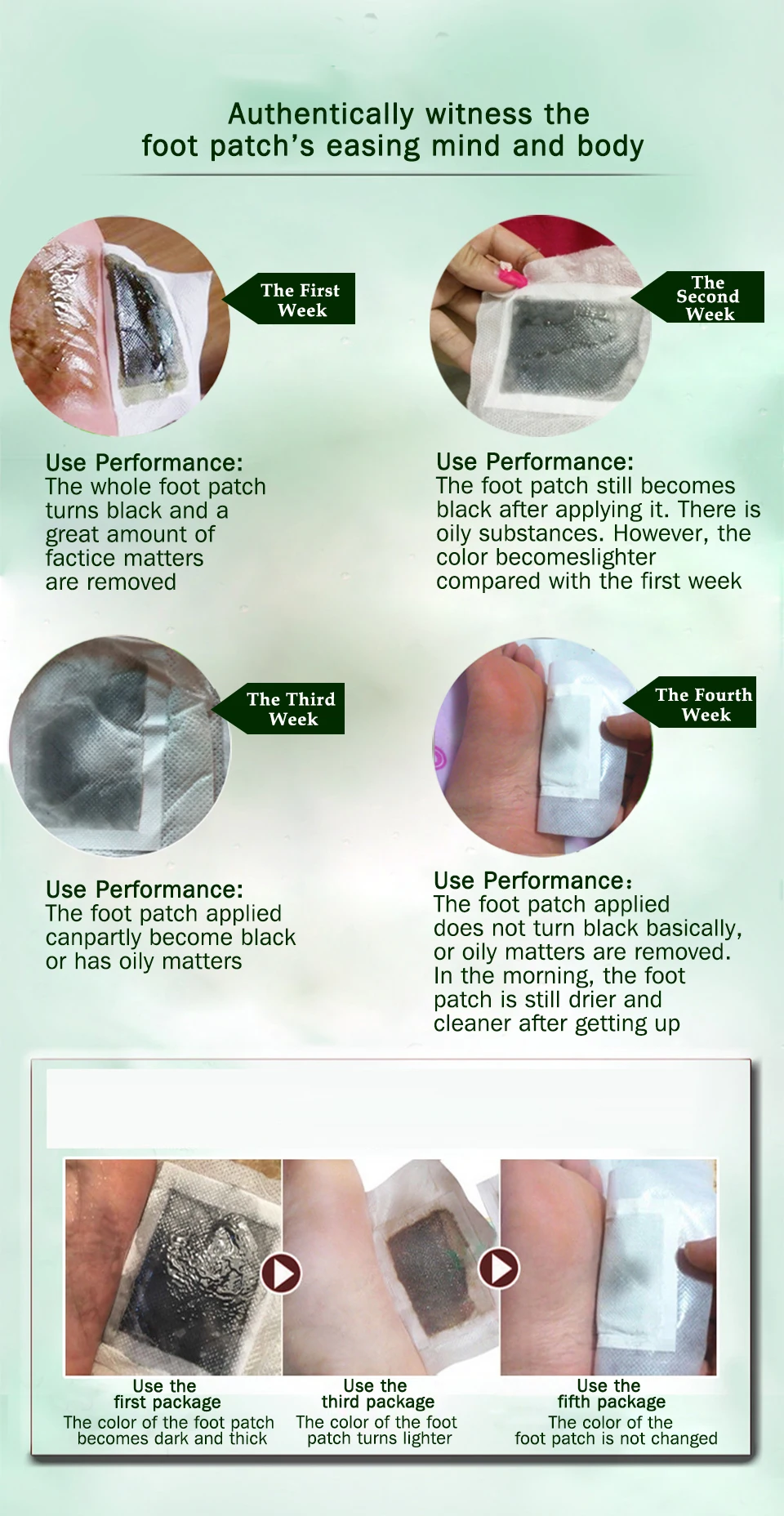 Убедительно убедиться в том, что пластырь для ног смягчает ум и тело, первое использование шеек: все ноги переворачиваются в черный цвет и agreat количество offactice mattersснимаются на второй неделе использования производительности: после нанесения пластырь на стопу все еще становится черным. Есть жирные вещества. Тем не менее, цвет становится легче по сравнению с первой неделей, используемой на третьей неделе: накладные накладки на стопу могут быть черными или имеют жирные свойства на 4-й неделе использования: накладные накладки на стопу в основном не тускнеют, или жирные вещества удаляются, в мороз, Пластырь для ног остается более сухим и чистым после того, как он вставлен, первая посылка, цвет пластырей для ног становится темным и толстым, используйте третью посылка, чтобы цвет пластырей для ног был более легким посылка; Цвет накладки на стопу не изменяется