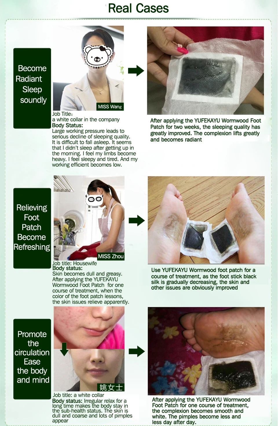 Отличная истина, почему пластырь для ног YUFEKAYU Wormwood работает только на нижней части стопы? Ниже приведены реальные tes клиента: которые соответственно применяются на руках, шангов и нижней части стопы. После применения в течение 8 часов, в настоящее время сравнение стопы является вторым сердцем "человеческого тела. Он также высоко оценен как главный «Здоровье и красота человеческого тела, Ilt является областью концентрации меридианов и точек человеческого тела и местом сбора жизненной сущности. Однако сердце находится далеко от сердца, а также является окончательным концом кровообращения человеческого тела. Таким образом, люди, которые чувствуют себя некомфортно в любой части и используют его интимно, должны нанести его на точку ноги Yongquan. Или другие части, и нога должна наносить его одновременно. Таким образом, эффект может быть очевидным.