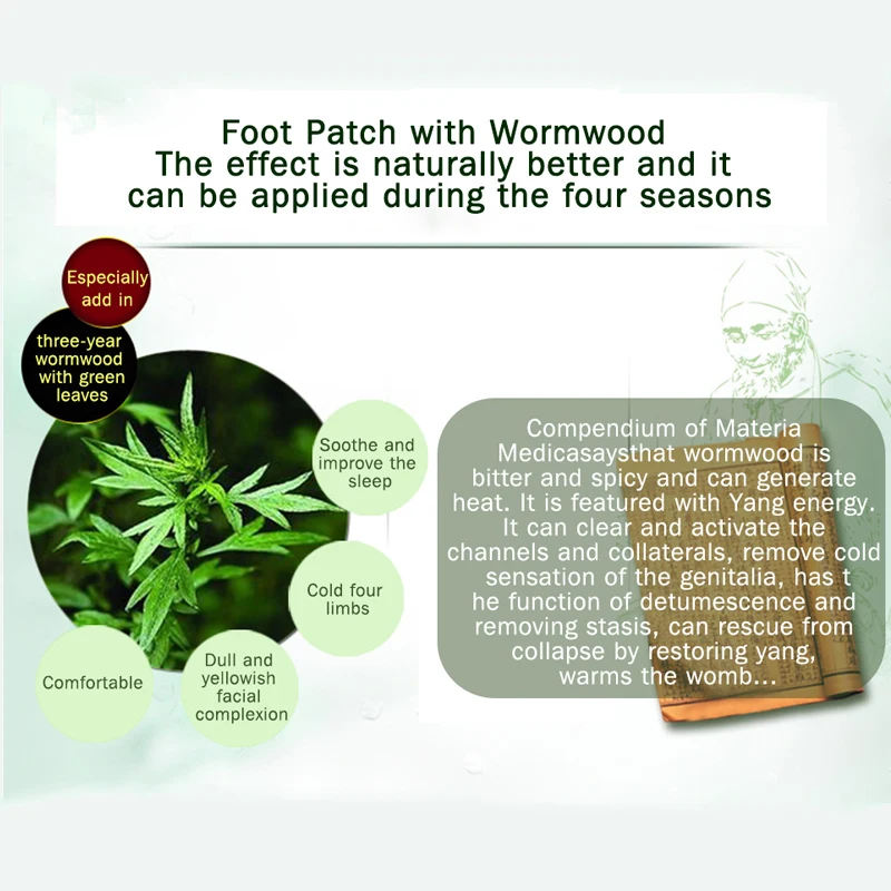 Пластырь для ног с полынью эффект естественно лучше, и он может быть применен в течение четырех сезонов Компендиум Materiar Medicasaysthat Wormwood горький и острый и может генерировать тепло. Он представлен с Yang energy. Он может очистить и активировать каналы и коллатералы, удалить холодное ощущение гениталий, имеет функцию дефузии и удаления застоя, может помочь от коллапса, восстановив Ян, согревает утробу .. Особенно добавляют в три года полынь с зелеными листьями, успокаивают и улучшают сон холодными четырьмя конечностями комфортный тусклый и желтоватый цвет лица