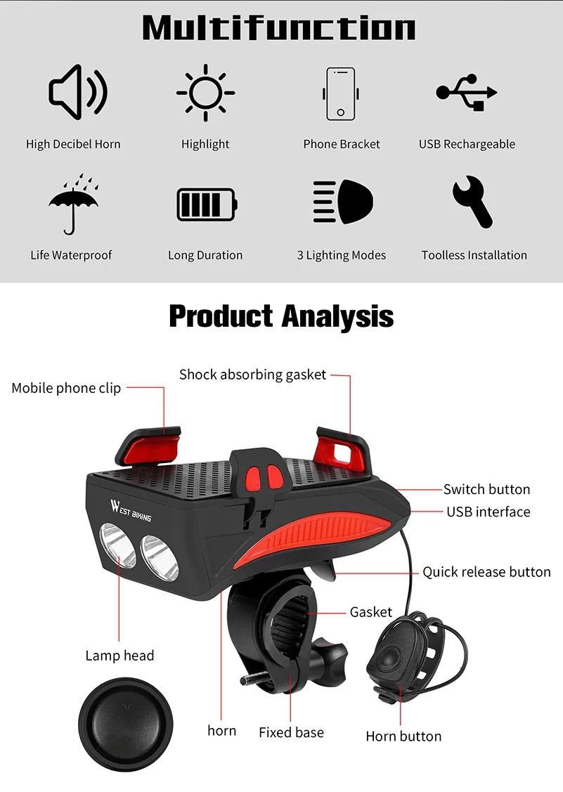 Item Name4 in 1 Bicycle Light (with phone holder and horn)
