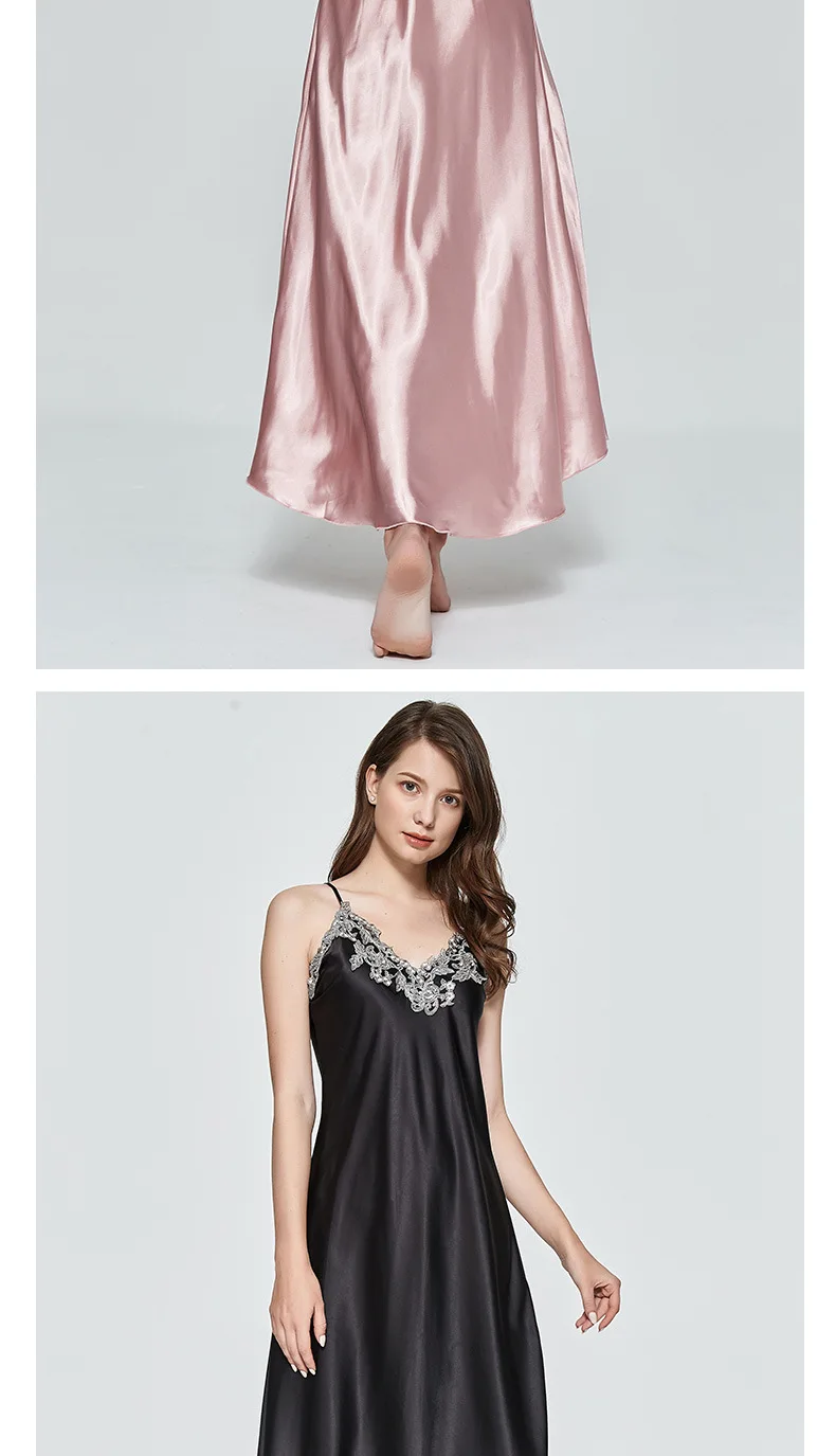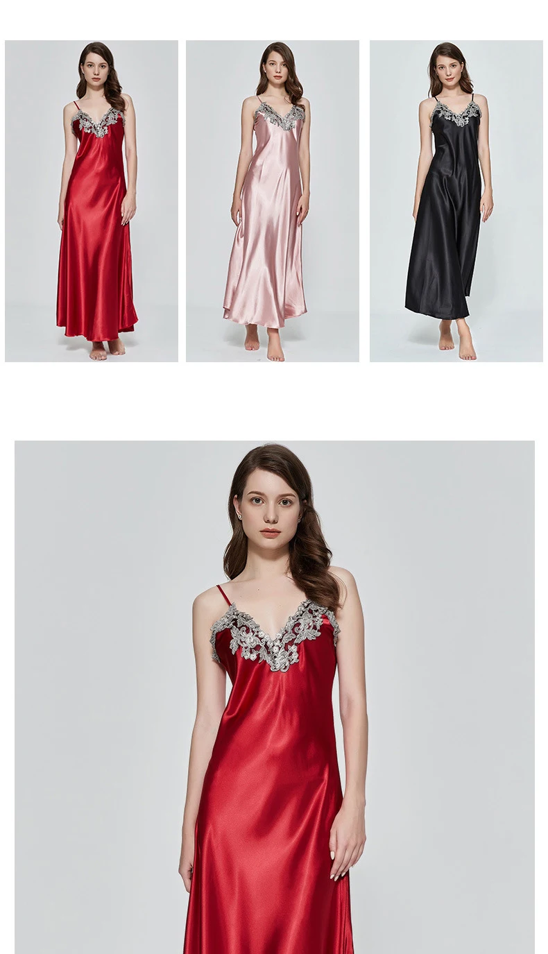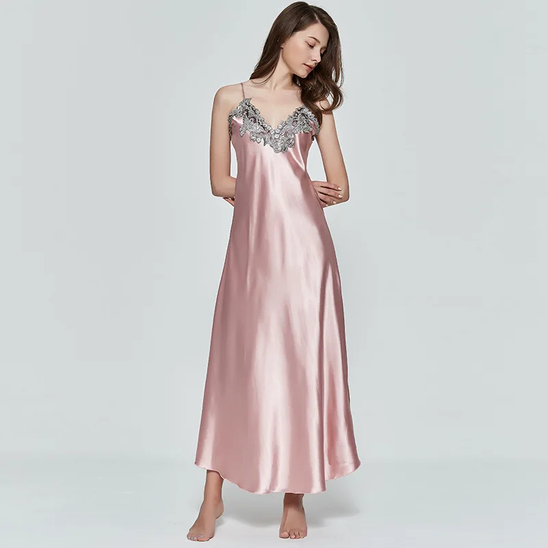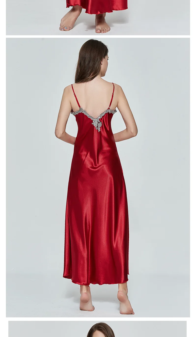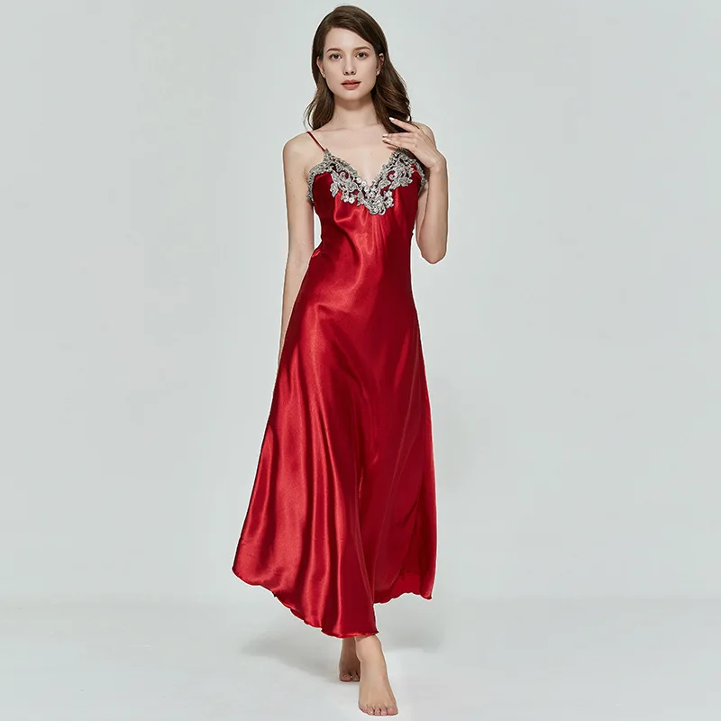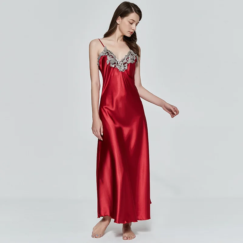 Шелковая длинная ночная рубашка для женщин, ночная сорочка на бретелях-спагетти, атласная одежда для сна, женское сексуальное кружевное платье с бахромой, ночная рубашка, домашняя одежда