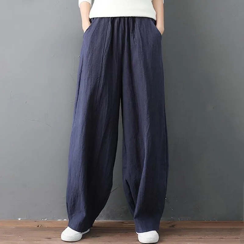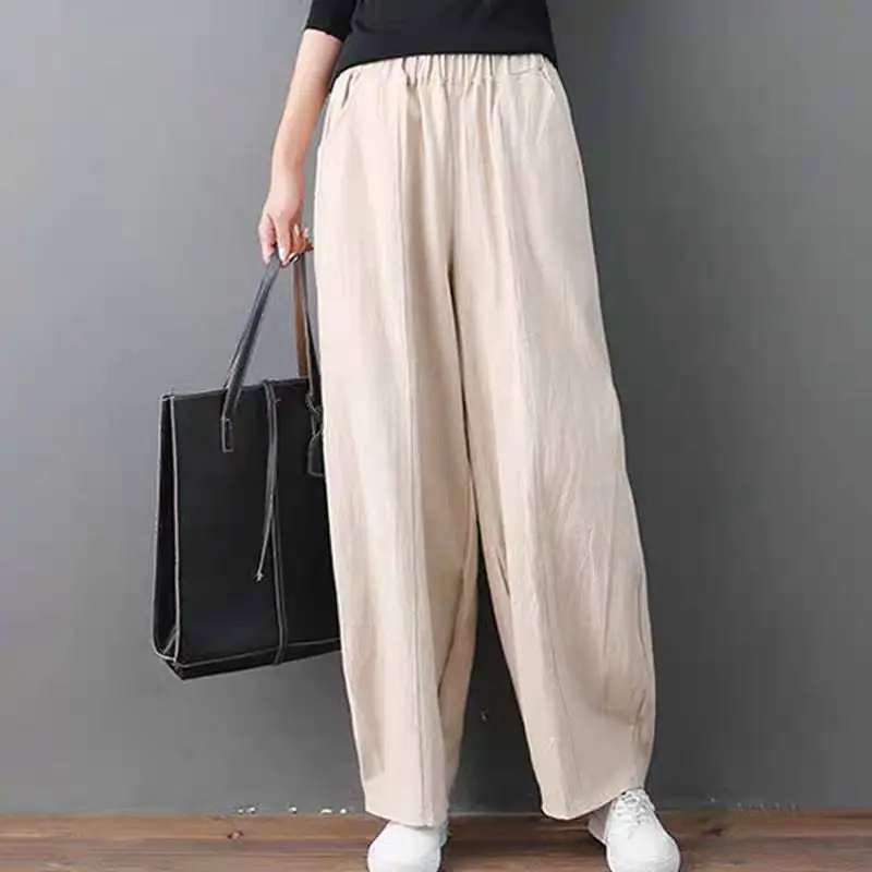 Брюки-шаровары женские, хлопковые, льняные, широкие, со складками, с карманами, осень размера плюс 2021