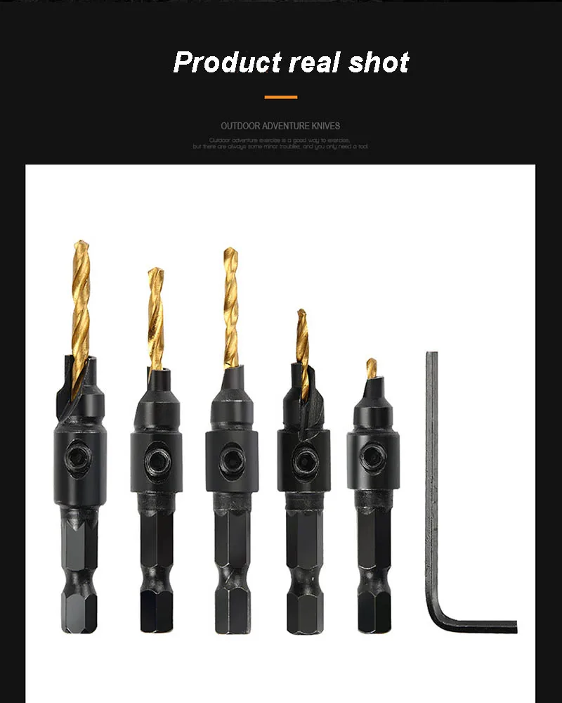 Особенности:Стандартный шестигранный хвостовик 1/4 дюйма совместим с быстрой заменой.Регулируемая глубина рукава с шестигранным гаечным ключом.Специально разработанные стальные столешницы или столешницы пилотное отверстие.Термообработанная, закаленная и прочная Высокоскоростная сталь для превосходной мощности резания.Более быстрый сброс опилок, вы получите хорошую гладкую поверхность на любом типе твердой, мягкой древесины или алюминия.Подходит для мягкого металла, изоляционной доски, ПВХ доски, деревянной доски и т. д.Характеристики:① Фаска для деревообработки: Высокоскоростная сталь.② Характеристики хвостовика: шестигранный хвостовик 1/4 дюйма.Упаковка включает в себя1 x #5 сверло для зенковки 1 x #6 сверло для зенковки 1 x #8 сверло для зенковки 1 x #10 сверло для зенковки 1 x #12 сверло для зенковки 1 х l-ключ