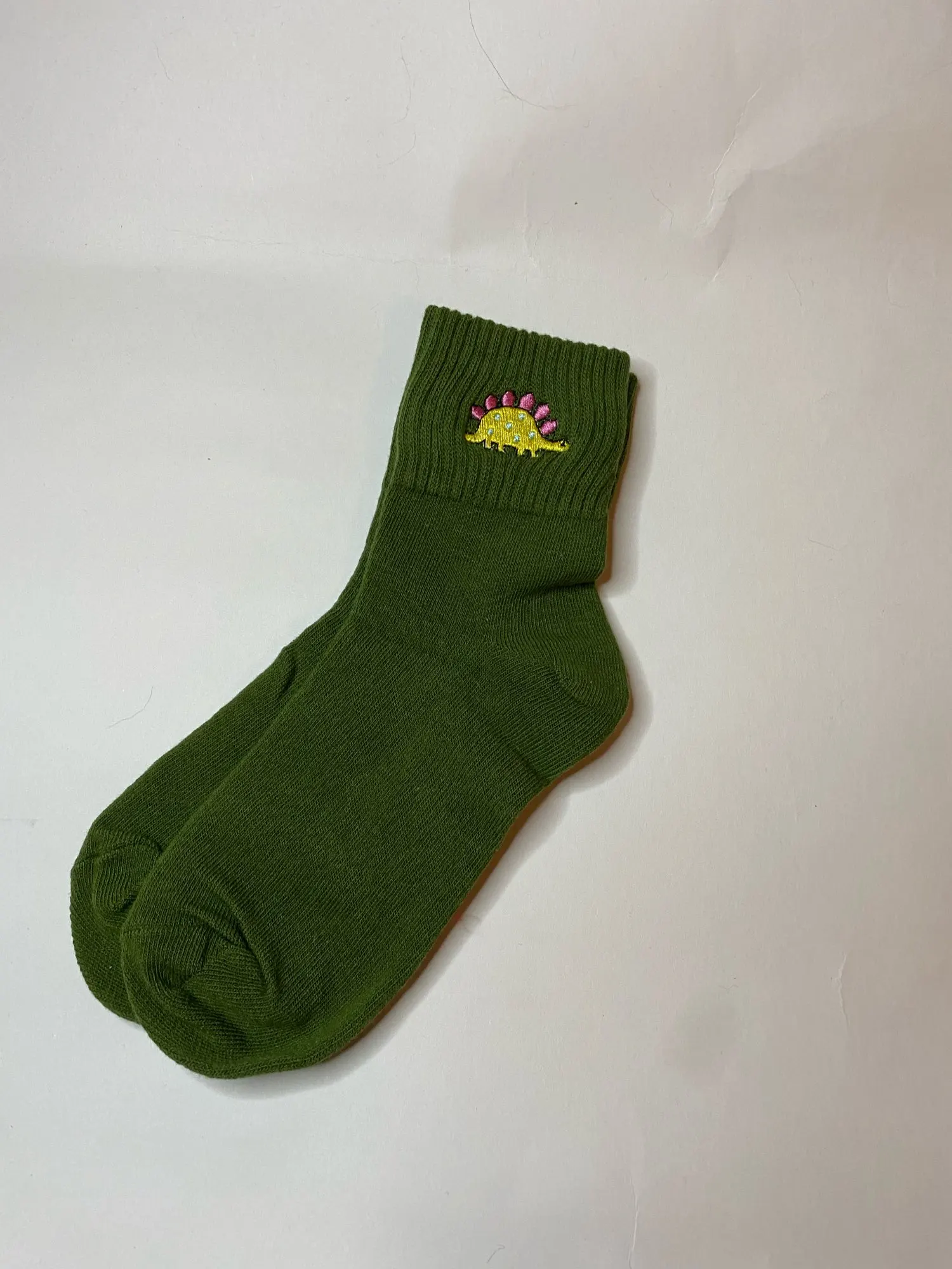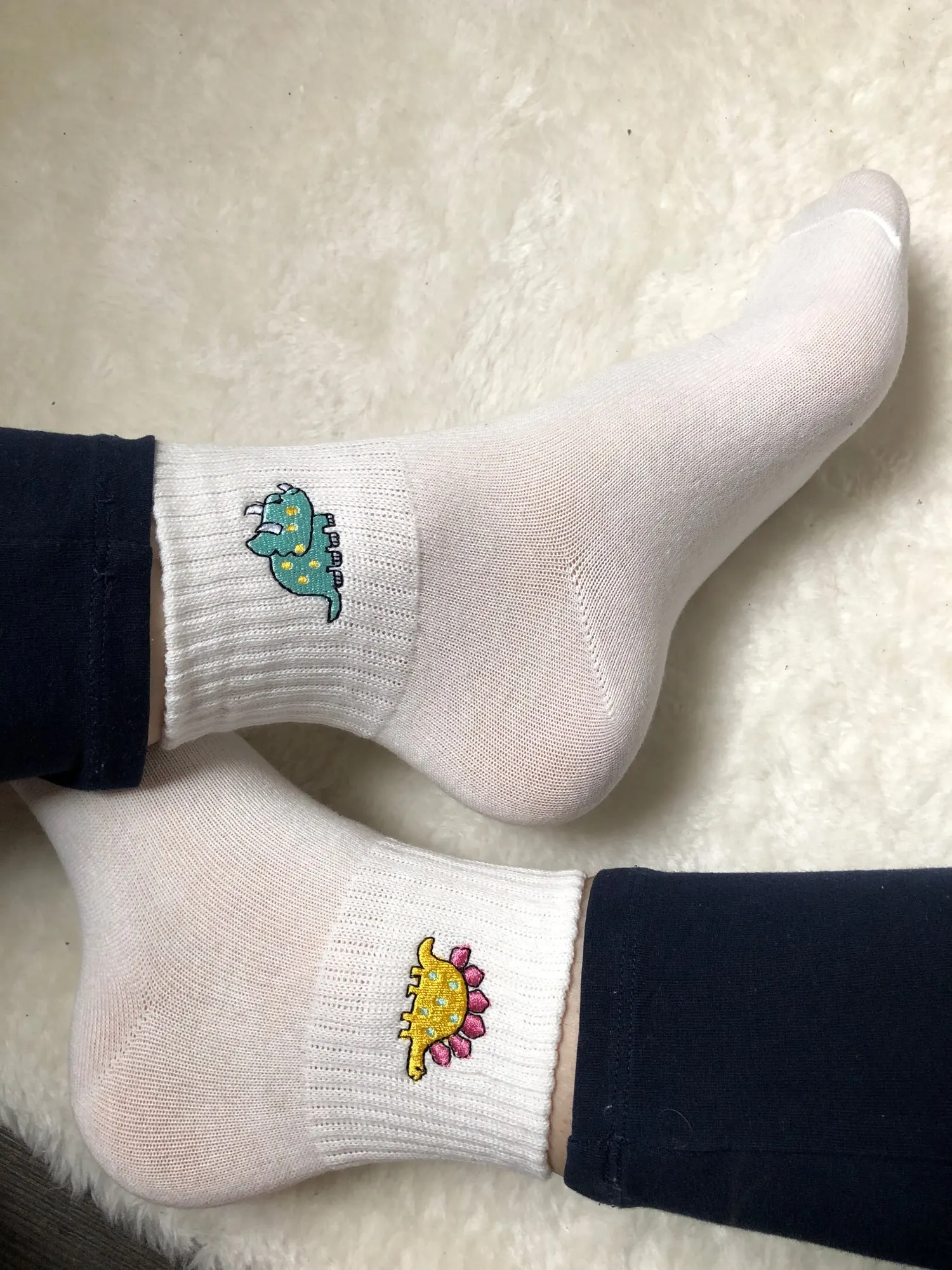 Милые женские хлопковые носки с вышивкой в виде динозавра, белые винтажные короткие носки с милыми мультяшными животными, новинка, сумасшедшие забавные уютные носки
