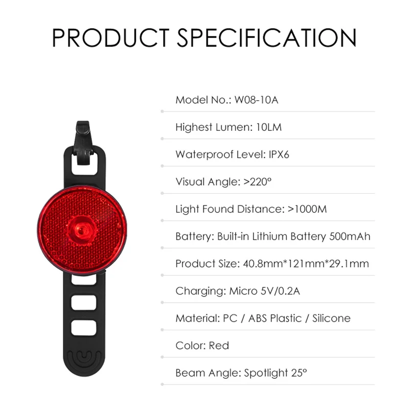 Обратите внимание, что изделие имеет два стиля:1) W08J-прожектор2) W08f-FloodlightW08J-прожекторИнформация о продукте:● Светильник Цвет: белый светильник;● Материал: Поликарбонат/АБС-пластик/силикагель;● Размеры: 40,8 мм * 21,5 мм/включая ремень Размеры: 40,8 мм * 121,0 мм * 29,1 мм● Аккумулятор: встроенный аккумулятор 500 мАч;● Зарядный: микро-вход 5В/0.2A;● Индикатор заряда батареи: мигает красный светильник 20%;● Время работы: самое длинное для тестирования;● Яркость: 20 ЛМ-10 лм;● Угол обзора: более 220 градусов;● Расстояние обнаружения автомобиля: более 1000 м;● Водонепроницаемость: IPX6; Описание:● Индикатор заряда: мигает зарядный красный светильник, и всегда мигает полный красный светильник;● Полностью интеллектуальная работа: автоматически обнаруживает и распознает, нужно ли ездить после включения питания, основной светильник состояния езды будет работать автоматически и автоматически погаснет после 120 секунд отдыха;● Работа по клавишам: Длительное нажатие 0.5S кнопка для включения переключателя/переключения передач;● Светоотражающий: 0 угол освещения; (светоотражающее предупреждение);● Угол освещения объектива: концентрирующийся 25 градусов;• Защита: 4,2 V защита от избыточного заряда благодаря/2,75 V Защита от разрядки/Защита от короткого замыкания;● Установка: Простая установка и установка без инструментов-силиконовый ремешок с шестерней;● 5 режимов передачи:Gao Changliang 20Lm-около 7,5 HНизкий постоянный светильник 10Lm-около 16,2 HПодсветка вспышки 20 ЛМ-около 51 чНизкий светильник flash 10Lm-около 92HДневная сигнальная вспышка-20 ЛМ-около 29 ч;