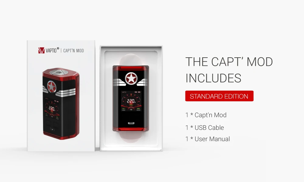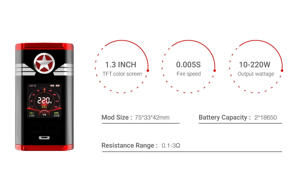 Размер мода: 75*33*42 мм Аккумулятор: внешний 2*18650 (не входит в комплект) Диапазон сопротивления: 0,15-3,0 Ом Экран дисплея: 1,3 дюйма, цветной, TFT Выходная мощность: 10-220 Вт Рекомендуемая мощность: 50-100 Вт Режим парения: VW/TC/Smart/CCW/CCT/Bypass