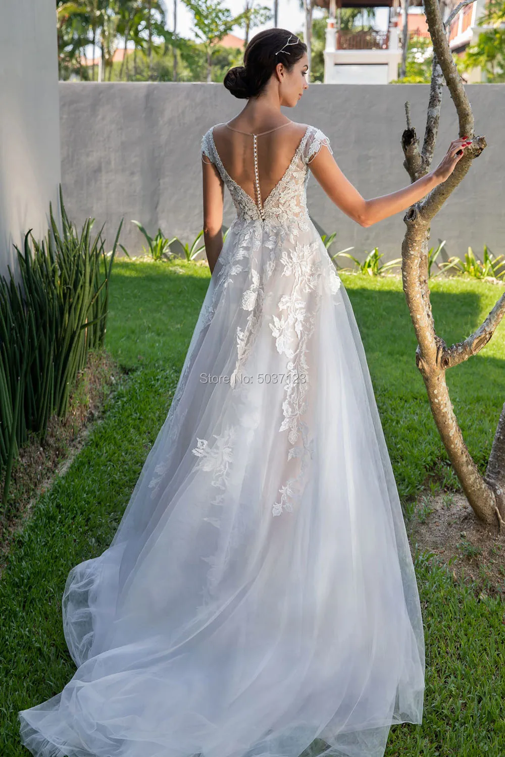 Женское платье с цветочной аппликацией, прозрачное ТРАПЕЦИЕВИДНОЕ свадебное платье из тюля с V-образным вырезом, открытой спиной и пуговицами, с кристаллами, 2019