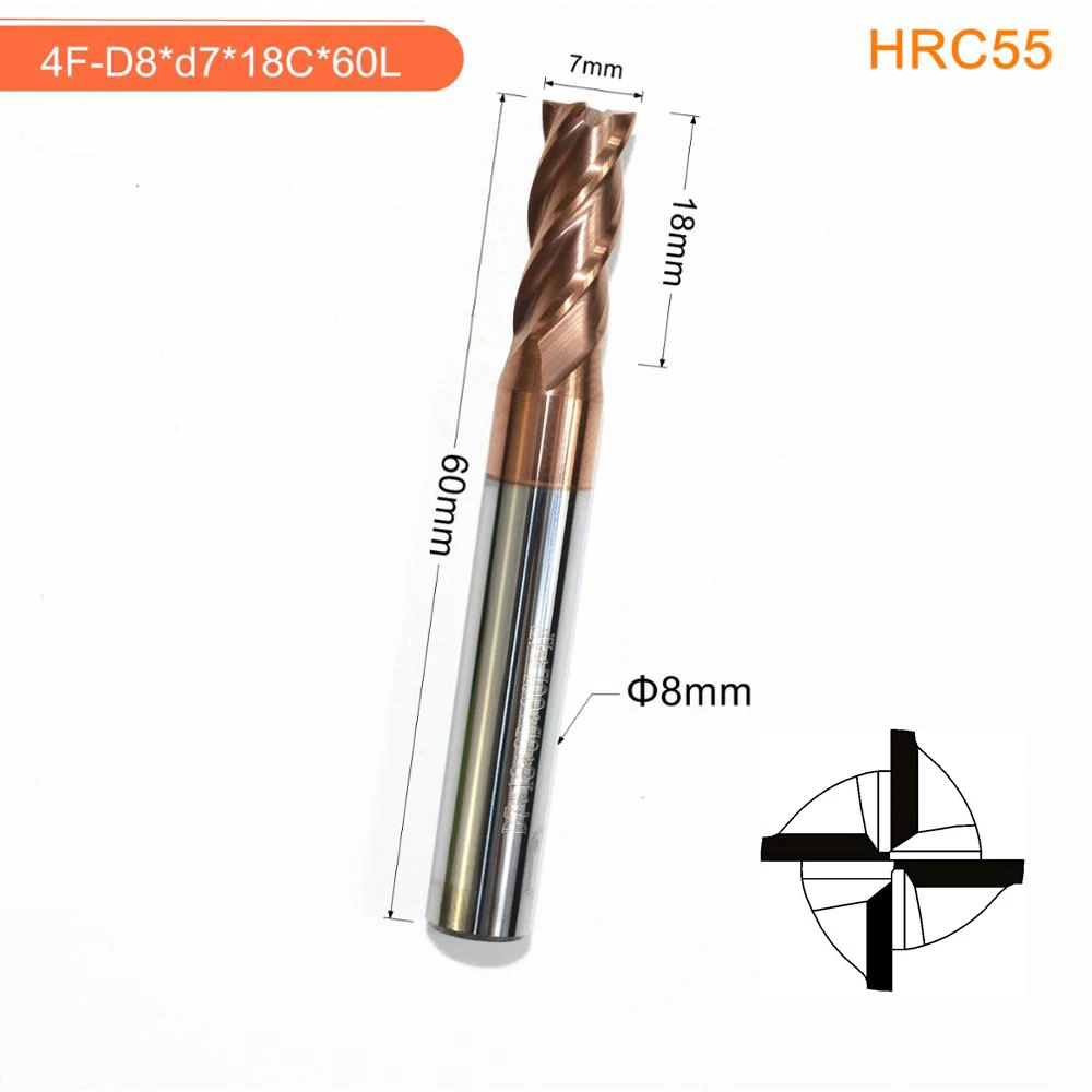 Твердосплавный Фрезерный резак D8 * d7 * 18C * 60L-CNC, HRC55 4-кратный спиральный плоский нижний концевой фрезерный станок, сталь с покрытием Tialn, железный режущий нож