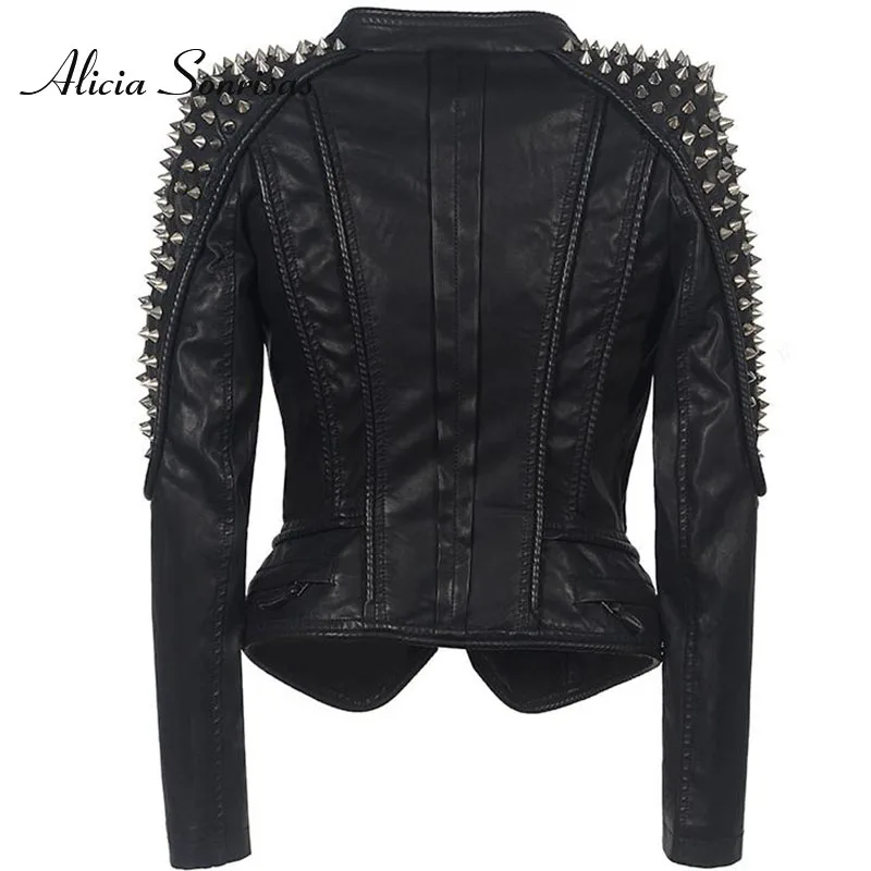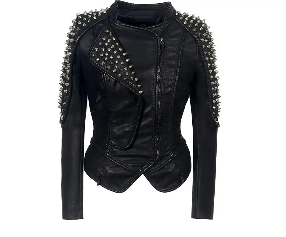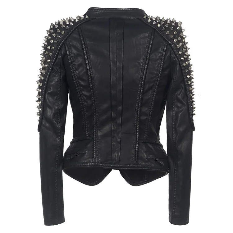 Женская кожаная куртка с шипами и звездами, облегающая байкерская куртка с серебряными металлическими заклепками, SX01