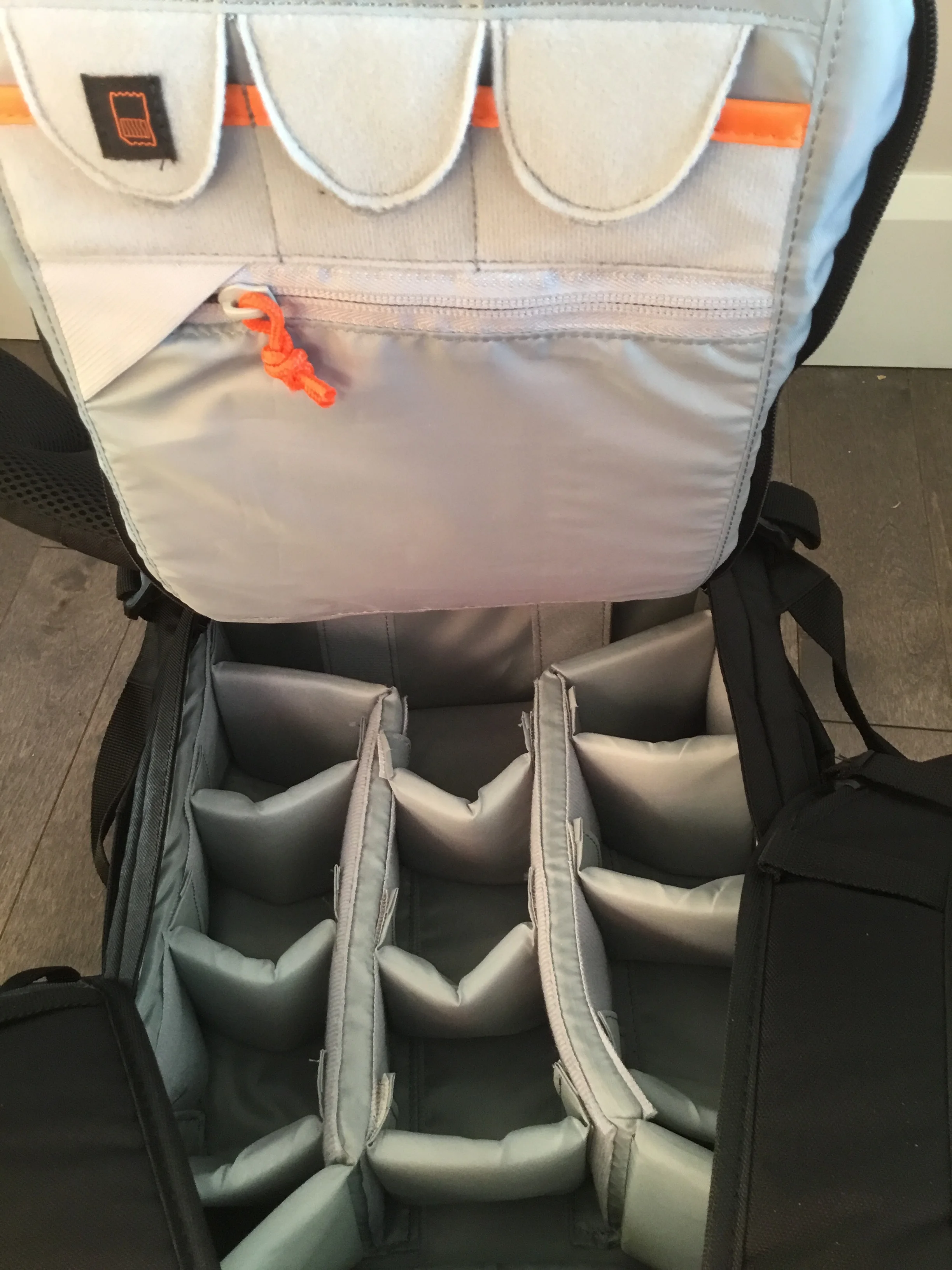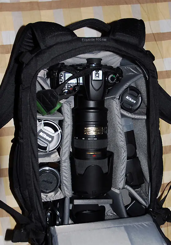 Рюкзак конденсатор, производит прочное впечатление. В нем: Корпус Nikon D750 x2 Nikkor 24-70 2,8 Nikkor 70-200 F4 Nikkor 85 мм 1,8 Sigma 35 мм 1,4 Ручка Вспышка x2 (одна в основном диапазоне, а другая в кармане спереди) Карта памяти, дополнительные батареи, ремни, затычки линз и другие мелкие предметы. Рекомендуется.