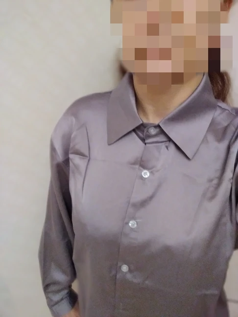 Получила заказ через 2месяца. Блузка на ощупь приятная, электризуется, потребуется антистатик. Брала L-ку на свой 46-48. При домашнем освещении кажется серой с сиреневатым отливом, спущенные плечи, ворот свободен, на полной шее будет получше. На рост 164 рукава длинноваты, а сама блузка по длине нормально. Меньше размер брать не стОит, т. к. при сгибах рук будет тянуть в спине. Пуговицы слишком простые, для лучшего вида надо подобрать другие.