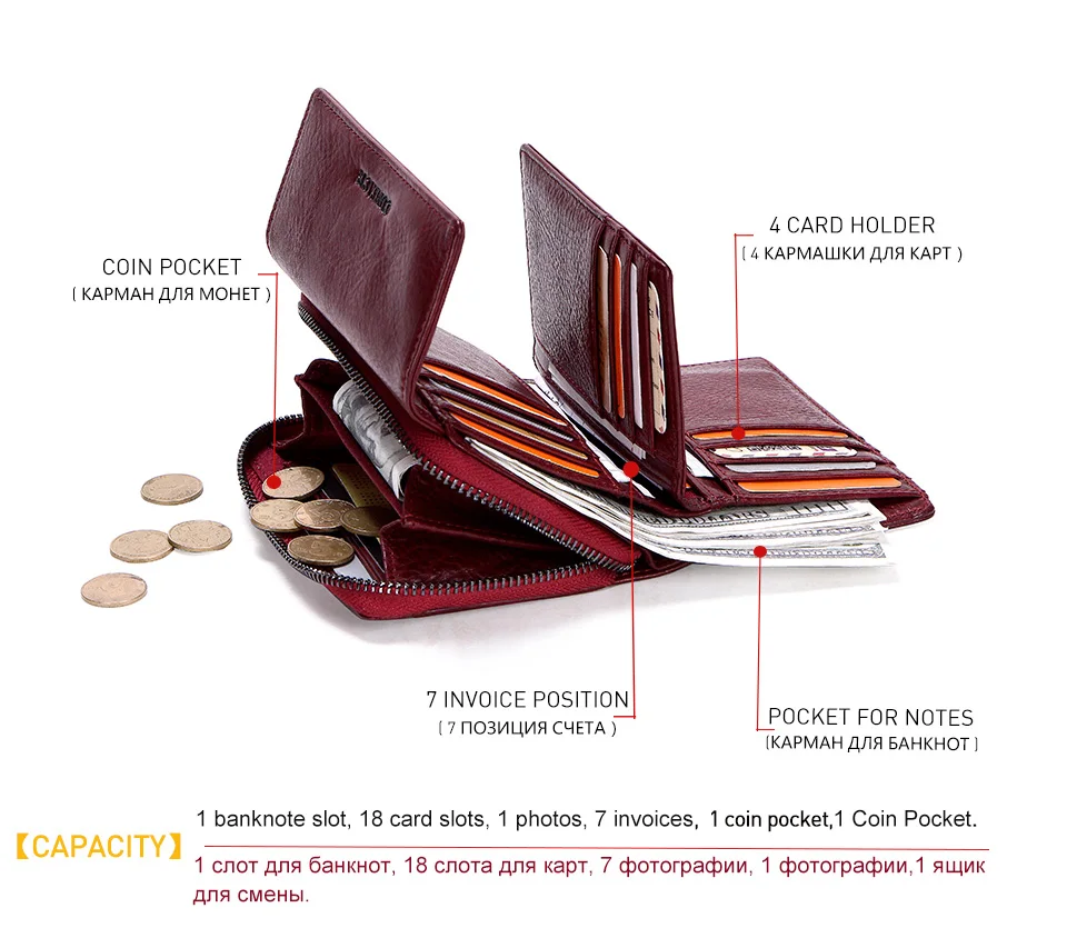 Cpacity18 card slots, 1 photo holder, 1 zipper pocket, 1 bill slot