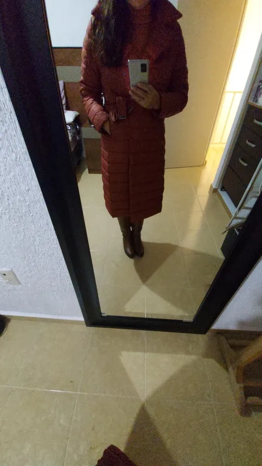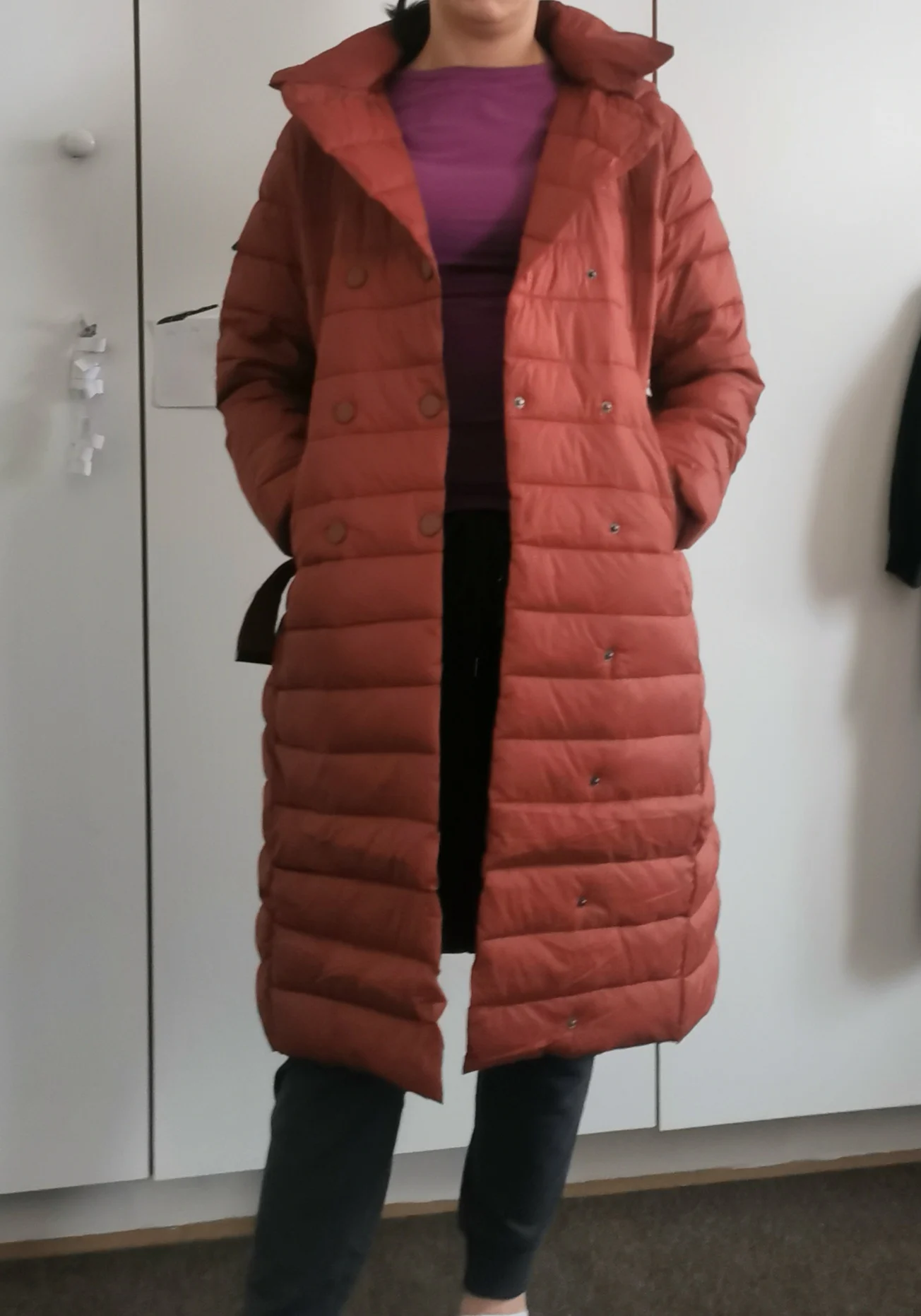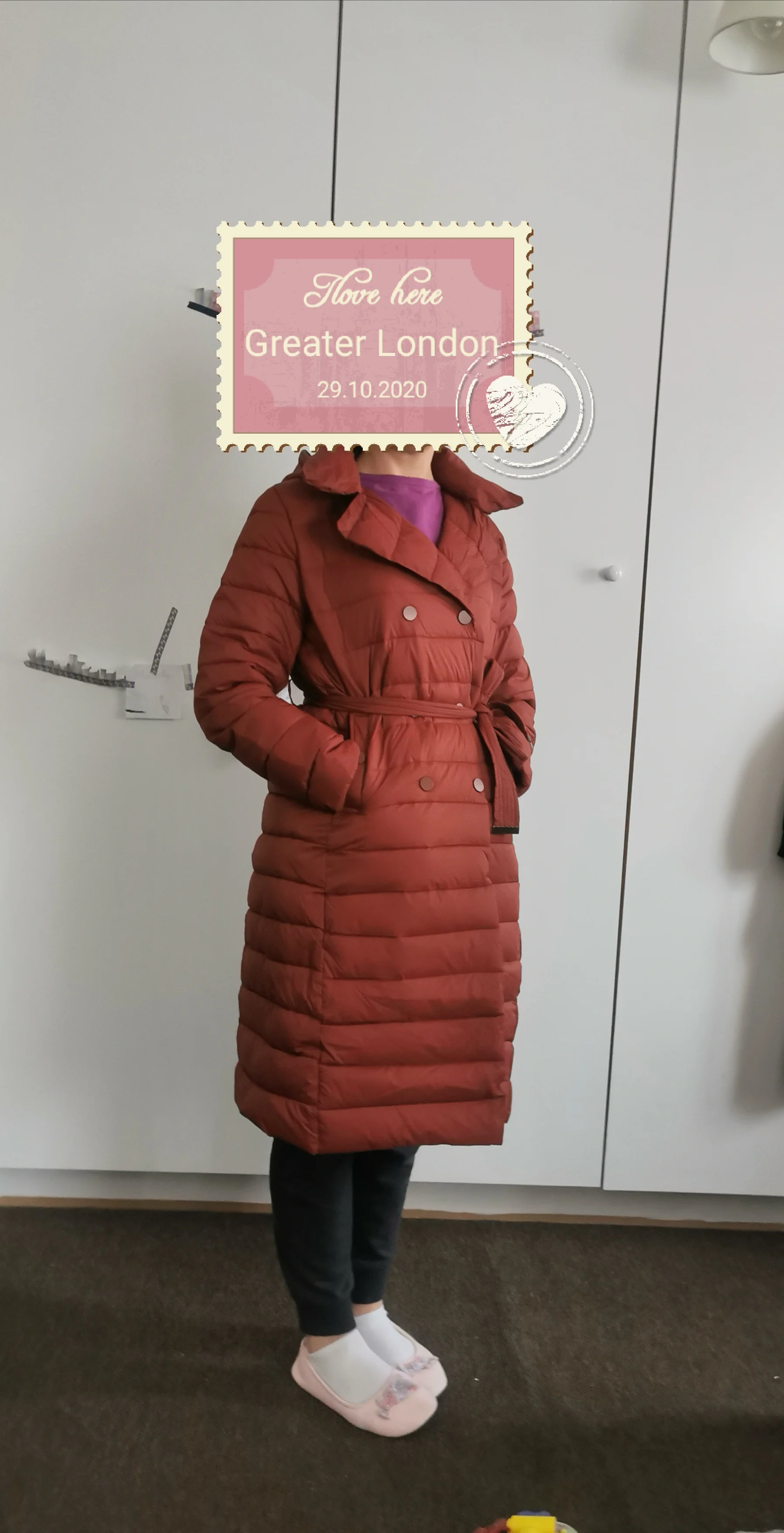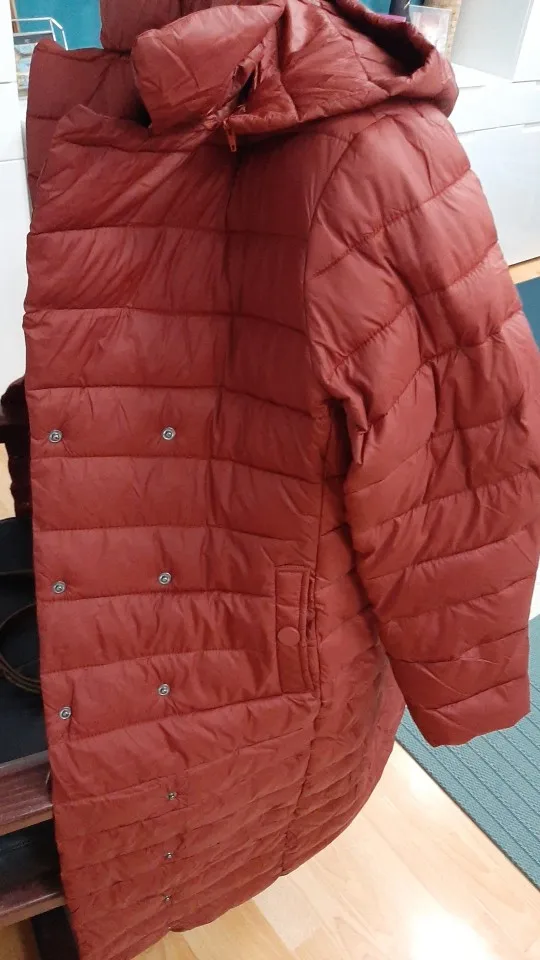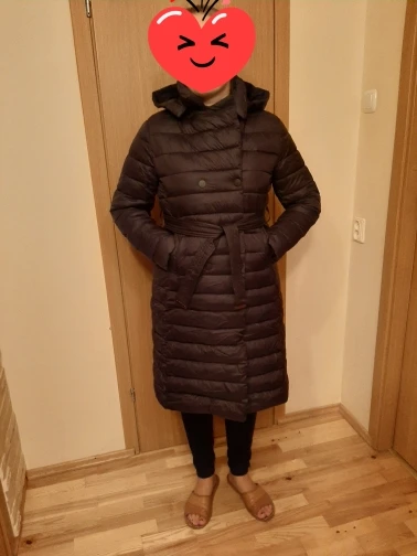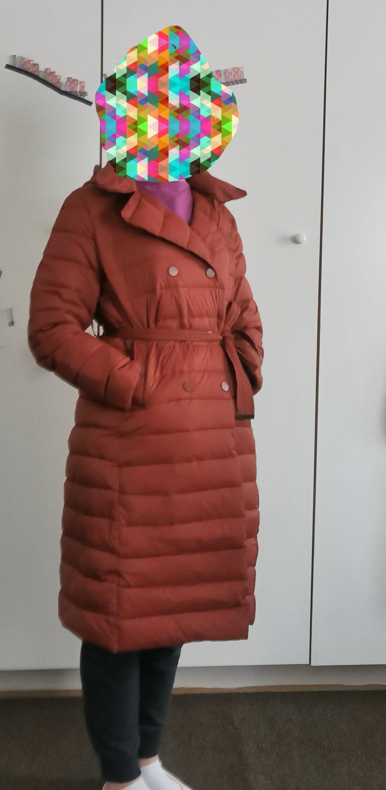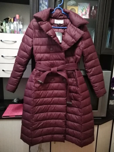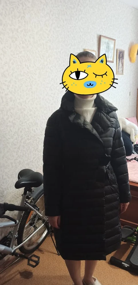 Пальто нормальное в соотношении цена/качество. Цвет вообще не как на картинке, болотный, почти чёрный. На русский 44 размер подошёл. Воротник закрывается, но пуговицы нет, так что в ветер или дождь шея открыта. В целом за такую цену хороший пуховик. Продавец положил резинку для волос в подарок.