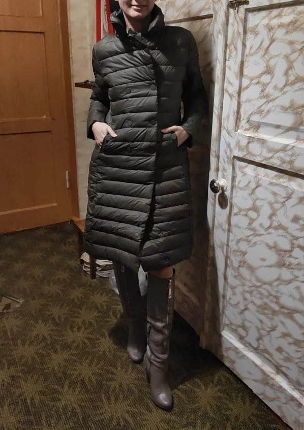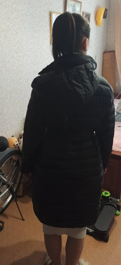 Пуховик по качеству отличный. Брала на свой рост 170 см xxl на нем стоит 185/105, но он явно не на 185. А на 165 по росту, т. к. талия у меня получилась завышена. Придётся без пояса носить. Длина на мой рост до колен, чуток выше.