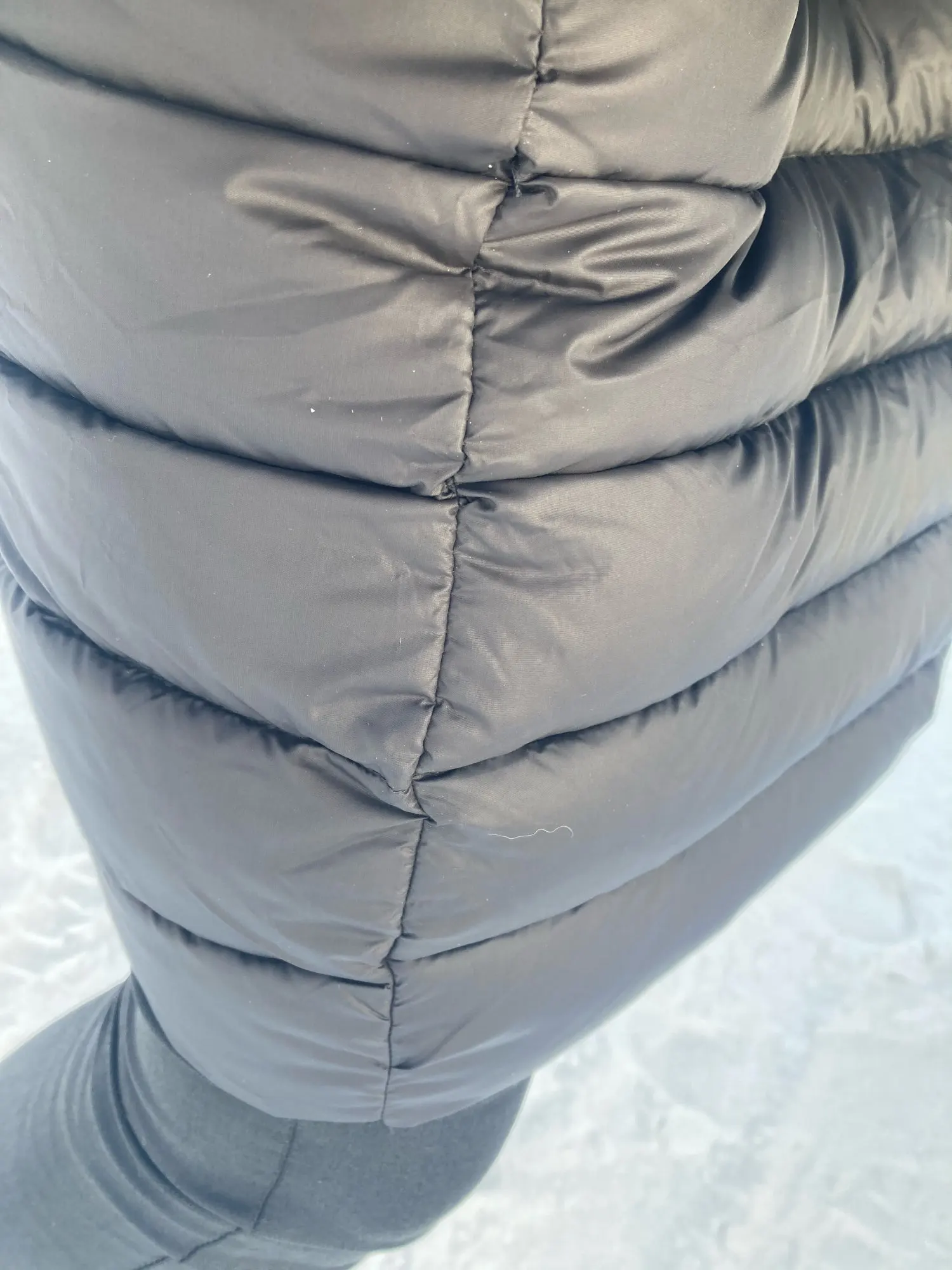 Прекрасный пуховичок. L на xs-s немного великоват. шлевки высоковато. на рост 164 закрывает колени. капюшон в самый раз.