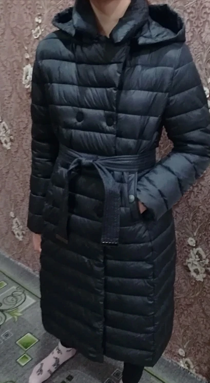Очень классное пальто, но конечно, не зимнее, скорее осенне-весеннее, стеганое, похоже на синтепоновое (но без подкладки), на кнопках, с карманами и поясом, капюшон отстегивается, воротник можно носить по-разному. На мой рост 163см пальто до колен, на параметры 88/70/100 идеально подошёл размер L. С доставкой PLUS, пришло за 4 дня в ближайший пункт выдачи. Спасибо магазину и продавцу, оч рада покупке.
