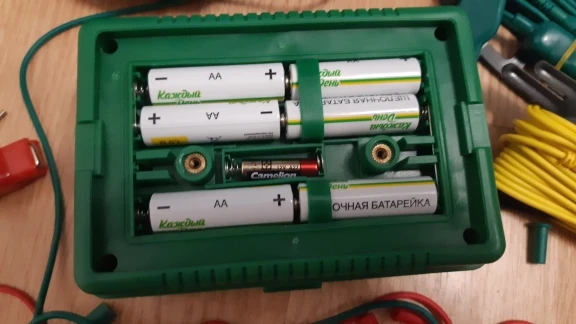 Отличный продукт! Все работает. В полевых условиях не пробовал, при подключении резистора в качестве теста сопротивление определил верно. В комплекте нет батареек. Прибор питается от 6 пальчиковых (АА) и одной на 12В (23А), об этом есть упоминание в главе Н инструкции, 5й пункт. На фото видно, что поставил 12 вольтовую батарейку не 23А, а А27, она тоньше, по длине такая же, прибор с ней прекрасно работает.