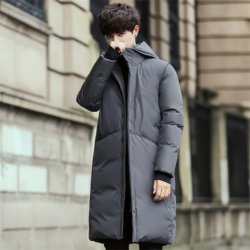 Мужской пуховик с капюшоном, черная длинная куртка на утином пуху, с защитой от ветра, теплая верхняя одежда для зимы