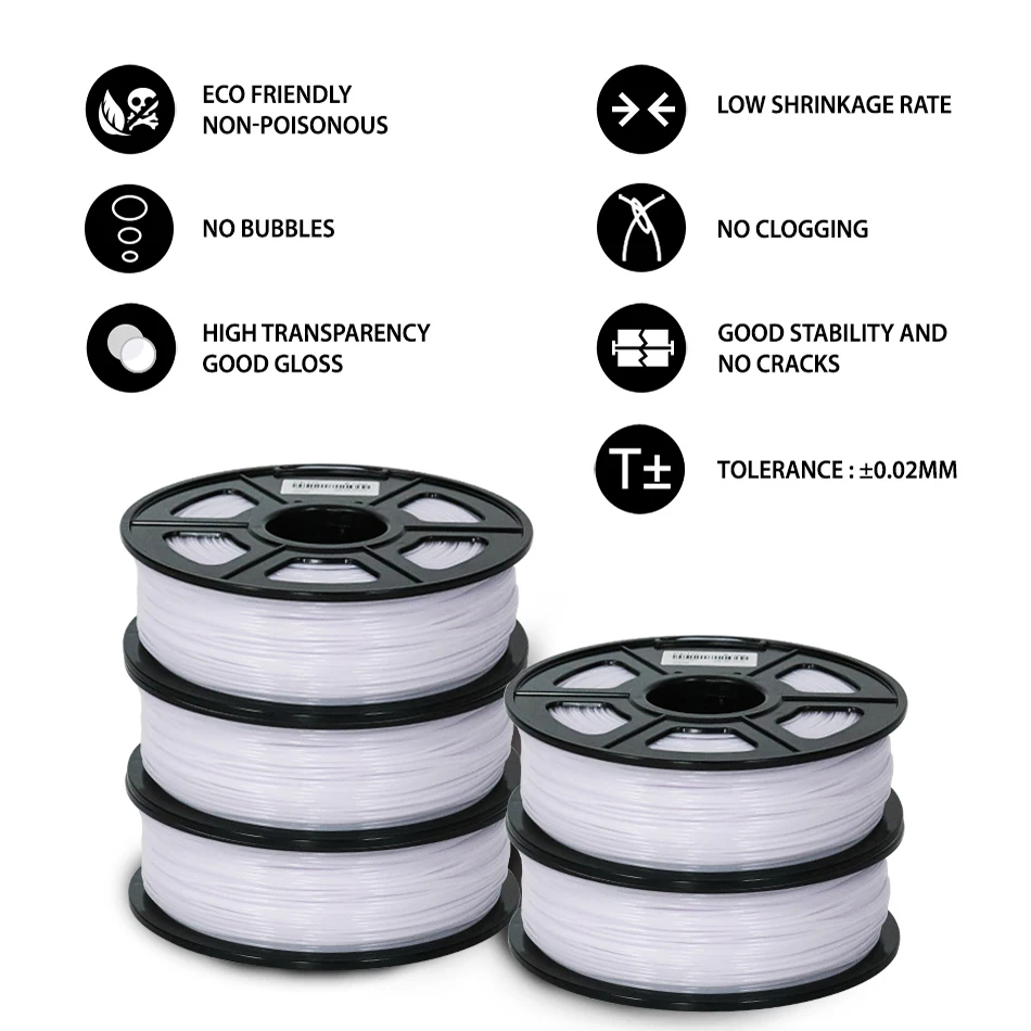 PETG нить хорошая прочность, высокая твердость, ударная прочность в 30 раз больше, чем PLA и удлинение при разрыве более 50 раз PLA.Совместимые принтеры должны иметь нагревательное устройство, могут печатать модели имеют строгие требования к прочности и прочности, такие как: pedant, также может печатать сильно термостойкие и прозрачные модели, такие как: lampshde.100% без Пузырькового 3d материала принтера.