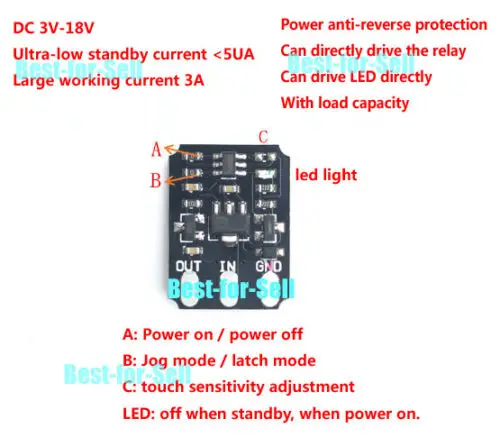 Размер печатной платы: 19*14 мм (Д * Ш)Прикоснитесь к задней части датчика, максимальное расстояние срабатывания 6 ммВход постоянного тока 3V-18V, ток в режиме ожидания: <5ua, максимальный выходной ток: 2.5AПо умолчанию три колодки: IN = вход питания +, GND = отрицательный, OUT = выходная мощность.Режим ожидания: выходное напряжение равно нулю, светодиодный индикатор выключается.Мощность на состоянии: выходное напряжение = входное напряжение, светодиодный светильник.Применение: светодиодный светильник, внешнее реле, выключатель питания, поддержка внешнего микроконтроллера.Используется для касания акриловой, стеклянной, керамической, пластиковой и другой медиаповерхности, толщина не более 6 мм.Описание режима A B C:Точка: оснащен резистором 0 Ом, эквивалентным перемычке, подключенному к включенному напряжению, отсоедините состояние для режима ожидания питания.B точка: оснащен резистором 0ohm, эквивалентным перемычке, подключенным к режиму самоблокировки, отключите состояние для режима пробежки.Точка C: сохранен чистый блокнот, эта точка для регулировки чувствительности. По умолчанию модуль является максимальной чувствительностью, если вы хотите уменьшить чувствительность, вы можете припаять конденсатор 1-50P.Эквивалентная схема модуля: Максимальный выходной ток2.5A @ 12VСамоблокирующийся: Коснитесь выхода, левая сторона выходила, затем коснитесь выключателя выхода.Jog: touch, OUT был выход, рука, чтобы оставить, немедленно закрыт.При установке, пожалуйста, установите модуль, а затем зарядите тест, не ставьте питание на объект, тогда он не будет работать. Размещение внешней поверхности изоляционного корпуса не может иметь покрытия, распыления металлической порошковой краски. Поверхность размещения должна быть гладкой, неровной, что повлияет на стабильность тестирования модуля. Для установки и вставки модуля не используйте двухсторонний клей из пенопласта, используйте тонкий высокотемпературный двусторонний клей. Или другой быстросохнущий клей может быть максимально тонким.