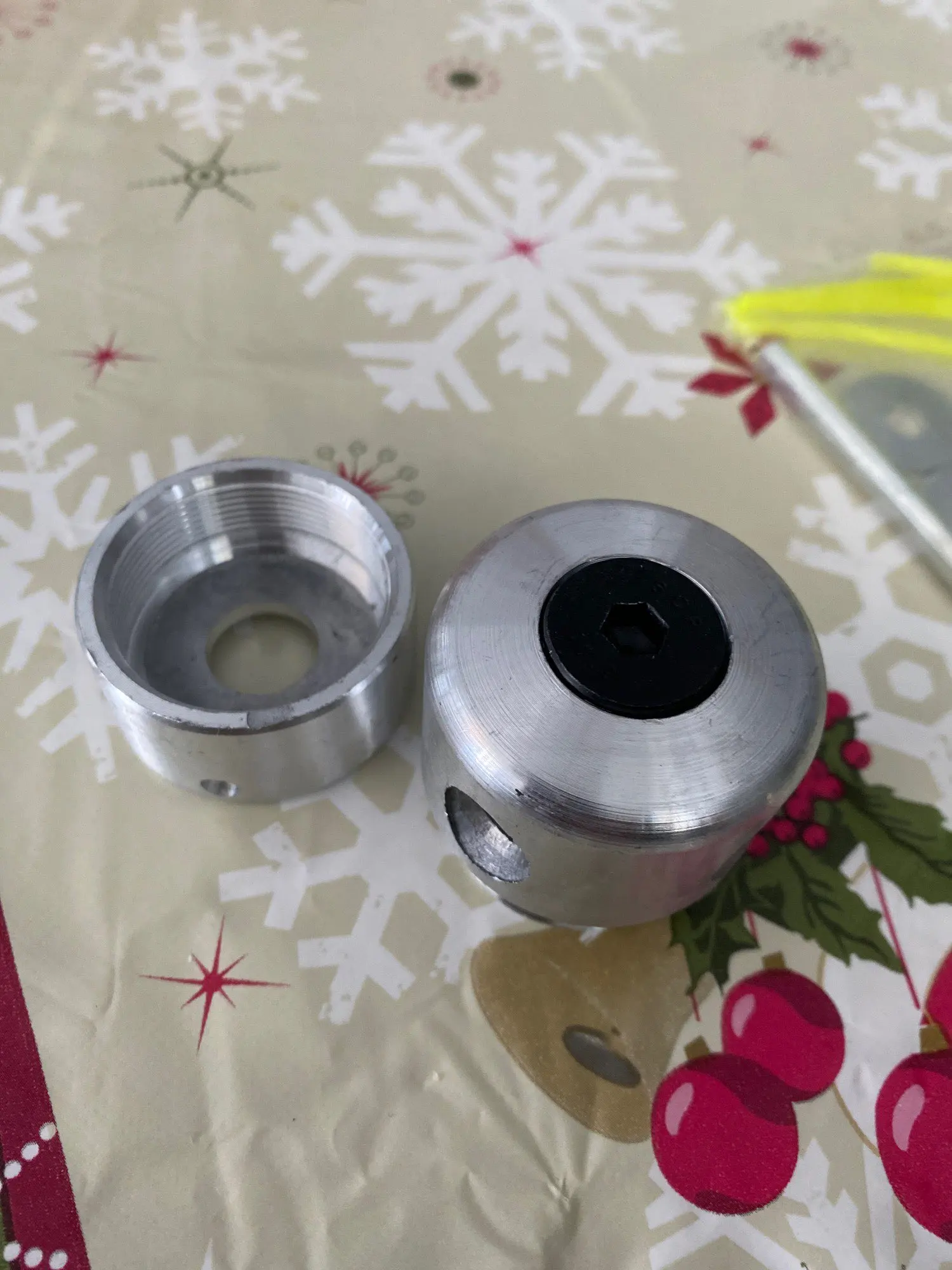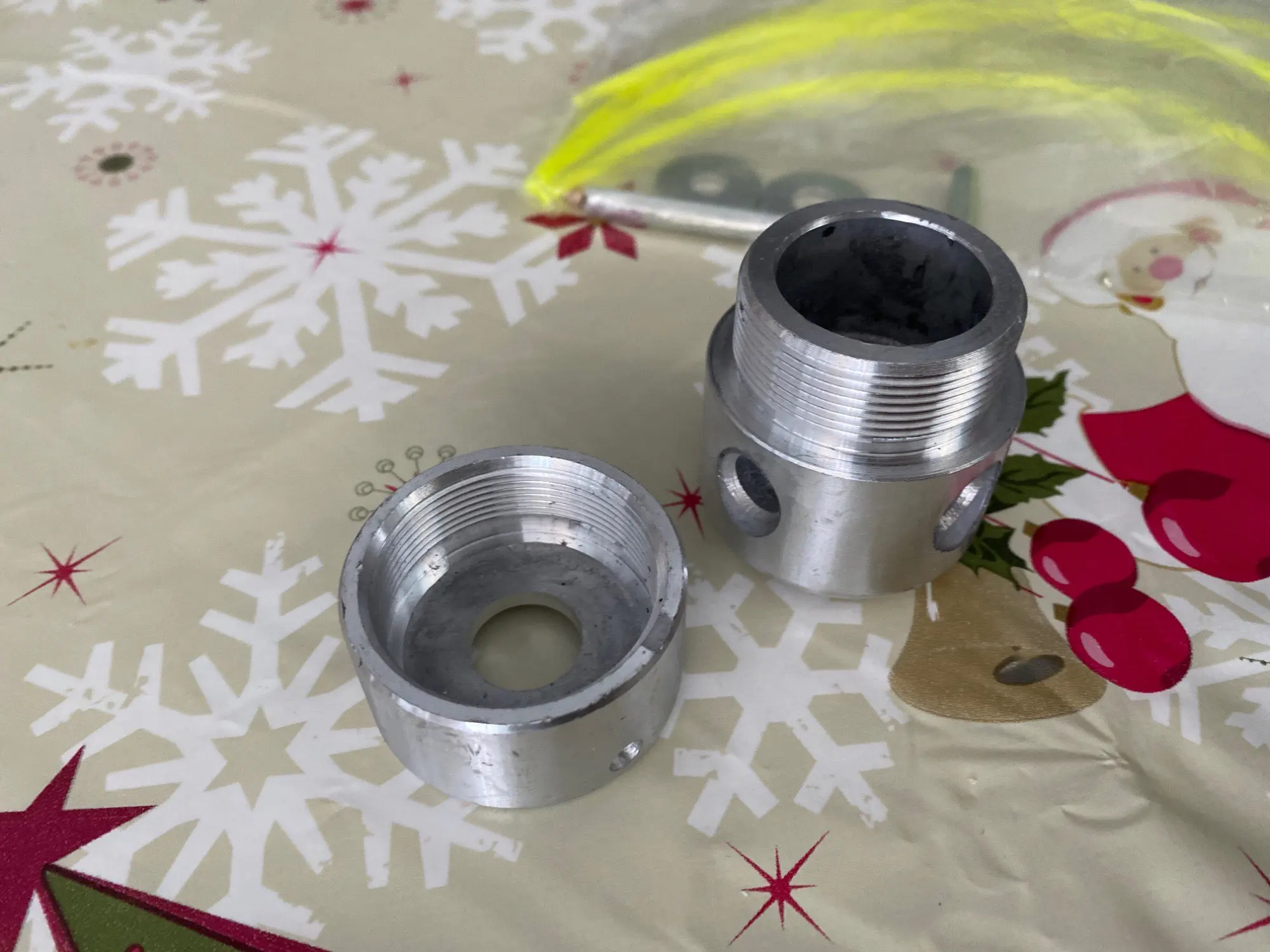 Алюминиевые части соединены левой резьбой, что очень хорошо, не будут раскручиваться. Есть на корпусе сверловка, похоже , что балансировали.