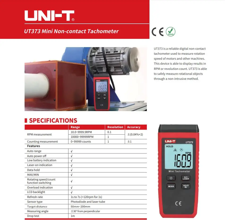 Компактный цифровой Бесконтактный лазерный тахометр UNI-T UT373, диапазон оборотов в минуту 10-99999 ОБмин, тахометр, одометр, подсветка кмч